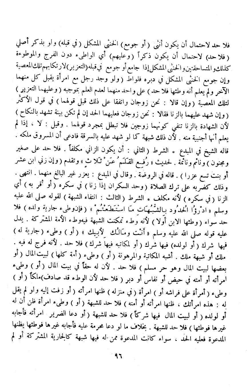 الشَّرْطُ (الثَّالِثُ: انْتِفَاءُ الشُّبْهَةِ) لِقَوْلِهِ - صَلَّى اللَّهُ عَلَيْهِ وَسَلَّمَ - «ادْرَءُوا الْحُدُودَ بِالشُّبُهَاتِ مَا اسْتَطَعْتُمْ» (فَإِنْ وَطِئَ جَارِيَةَ وَلَدِهِ) فَلَا حَدَّ سَوَاءٌ (وَطِئَهَا الِابْنُ أَوْ لَا) لِأَنَّهُ وَطْءٌ تَمَكَّنَتْ الشُّبْهَةُ فِيهِ وَطْءُ الْأَمَةِ الْمُشْتَرَكَةِ يَدُلّ عَلَيْهِ قَوْلُهُ - صَلَّى اللَّهُ عَلَيْهِ وَسَلَّمَ - «أَنْتَ وَمَالُكَ لِأَبِيكَ» (أَوْ) وَطِئَ (جَارِيَةً لَهُ) فِيهَا شِرْكٌ (أَوْ لِوَلَدِهِ) فِيهَا شِرْكٌ (أَوْ لِمُكَاتَبِهِ فِيهَا شِرْكٌ) فَلَا حَدَّ لِأَنَّهُ فَرْجٌ لَهُ فِيهِ مِلْكٌ أَوْ شُبْهَةُ مِلْكٍ أَشْبَهَ الْمُكَاتَبَةَ وَالْمَرْهُونَةَ (أَوْ) وَطِئَ (أَمَةً كُلَّهَا) لِبَيْتِ الْمَالِ (أَوْ بَعْضَهَا لِبَيْتِ الْمَالِ وَهُوَ حُرٌّ مُسْلِمٌ) فَلَا حَدَّ؛ لِأَنَّ لَهُ حَقًّا فِي بَيْتِ الْمَالِ.