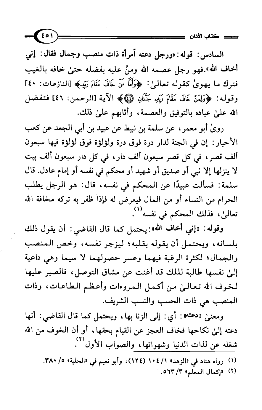 السادس: قوله: "ورجل دعته امرأة ذات منصب وجمال فقال: إني أخاف الله". فهو رجل عصمه الله ومنَّ عليه بفضله حتى خافه بالغيب فترك ما يهوى كقوله تعالى: {وَأَمَّا مَنْ خَافَ مَقَامَ رَبِّهِ} [النازعات:40] وقوله: {وَلِمَنْ خَافَ مَقَامَ رَبِّهِ جَنَّتَانِ (46)} [الرحمن: 46] فتفضل الله على عباده بالتوفيق والعصمة، وأثابهم على ذلك.