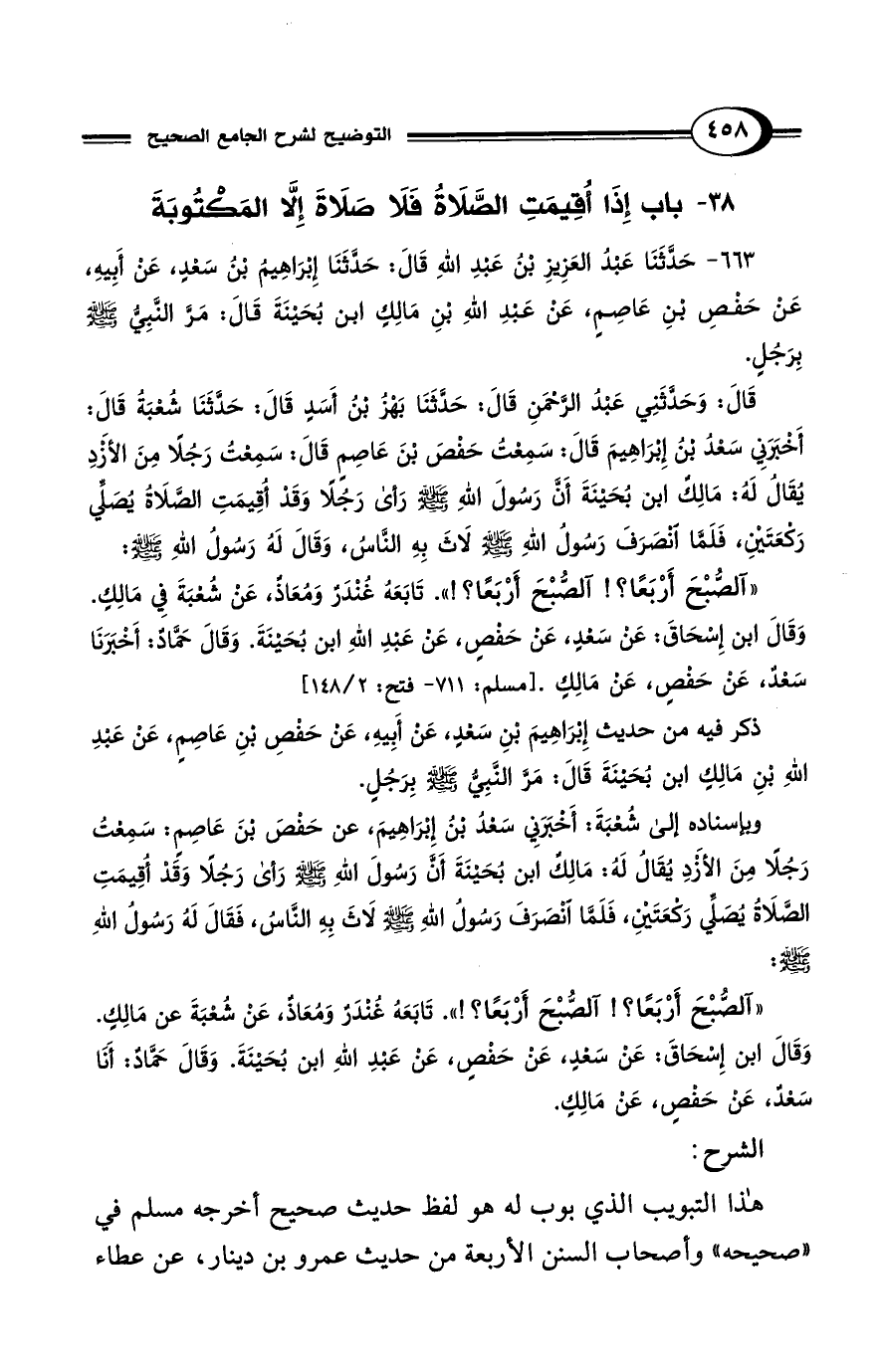 وبإسناده إلى شُعْبَةَ: أَخبَرَنِي سَعدُ بنُ إِبْرَاهِيمَ، عن حَفْصَ بن عَاصِمٍ: سَمِعتُ رَجُلًا مِنَ الأَزْدِ يُقَالُ لَهُ: مَالِكٌ ابن بُحَينَةَ أَنَّ رَسُولَ اللهِ - صلى الله عليه وسلم - رَأى رَجُلًا وَقَدْ أُقِيمَتِ الصَّلَاةُ يُصَلِّي رَكْعَتَيْنِ، فَلَمَّا انْصَرَفَ رَسُولُ اللهِ - صلى الله عليه وسلم - لَاثَ بِهِ النَّاسُ، فَقَالَ لَهُ رَسُولُ اللهِ - صلى الله عليه وسلم -: