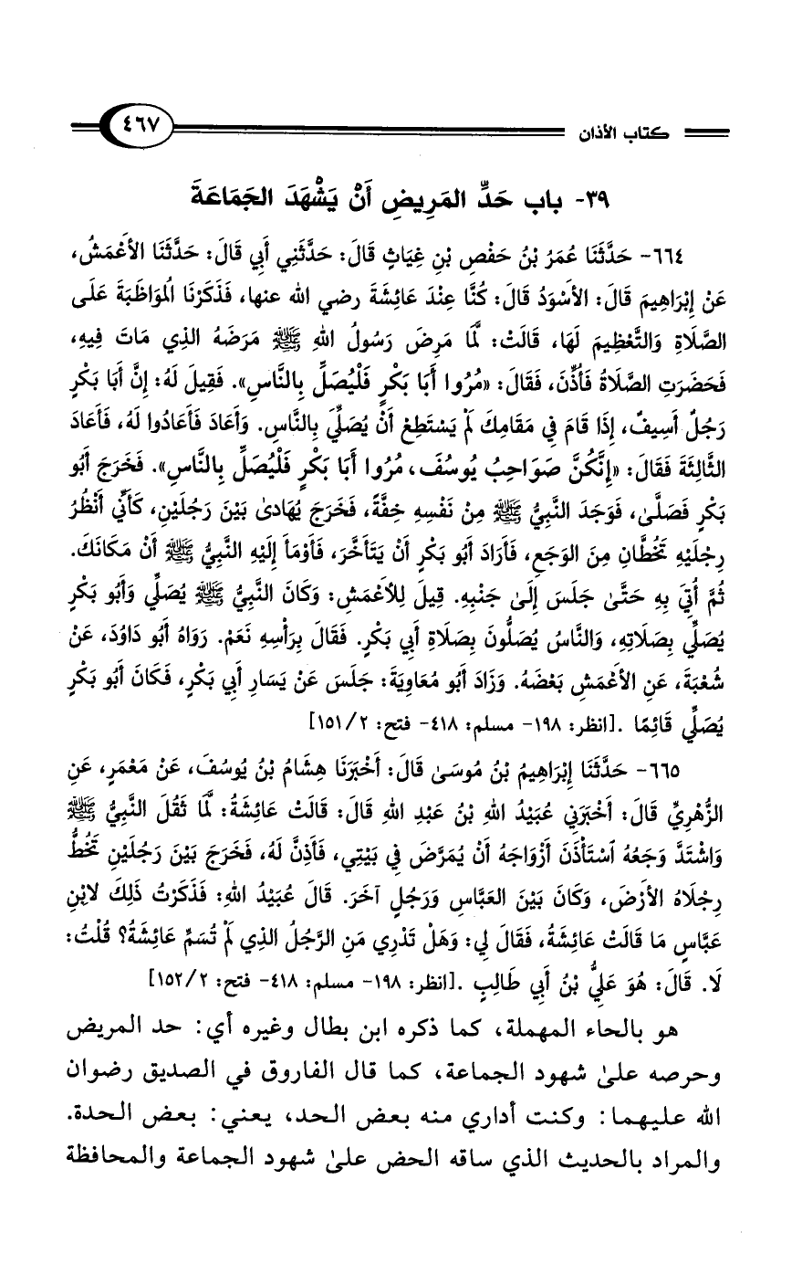 664 - حَدَّثَنَا عُمَرُ بْنُ حَفْصِ بْنِ غِيَاثٍ قَالَ: حَدَّثَنِي أَبِي قَالَ: حَدَّثَنَا الأَعْمَشُ، عَنْ إِبْرَاهِيمَ قَالَ: الأَسْوَدُ قَالَ: كُنَّا عِنْدَ عَائِشَةَ - رضى الله عنها - فَذَكَرْنَا الْمُوَاظَبَةَ عَلَى الصَّلاَةِ وَالتَّعْظِيمَ لَهَا، قَالَتْ: لَمَّا مَرِضَ رَسُولُ اللهِ - صلى الله عليه وسلم - مَرَضَهُ الَّذِي مَاتَ فِيهِ، فَحَضَرَتِ الصَّلاَةُ فَأُذِّنَ، فَقَالَ: "مُرُوا أَبَا بَكْرٍ فَلْيُصَلِّ بِالنَّاسِ". فَقِيلَ لَهُ: إِنَّ أَبَا بَكْرٍ رَجُلٌ أَسِيفٌ، إِذَا قَامَ فِي مَقَامِكَ لَمْ يَسْتَطِعْ أَنْ يُصَلِّيَ بِالنَّاسِ. وَأَعَادَ فَأَعَادُوا لَهُ، فَأَعَادَ الثَّالِثَةَ فَقَالَ: "إِنَّكُنَّ صَوَاحِبُ يُوسُفَ، مُرُوا أَبَا بَكْرٍ فَلْيُصَلِّ بِالنَّاسِ". فَخَرَجَ أَبُو بَكْرٍ فَصَلَّى، فَوَجَدَ النَّبِيُّ - صلى الله عليه وسلم - مِنْ نَفْسِهِ خِفَّةً، فَخَرَجَ يُهَادَى بَيْنَ رَجُلَيْنِ، كَأَنِّي أَنْظُرُ رِجْلَيْهِ تَخُطَّانِ مِنَ الْوَجَعِ، فَأَرَادَ أَبُو بَكْرٍ أَنْ يَتَأَخَّرَ، فَأَوْمَأَ إِلَيْهِ النَّبِيُّ - صلى الله عليه وسلم - أَنْ مَكَانَكَ. ثُمَّ أُتِيَ بِهِ حَتَّى جَلَسَ إِلَى جَنْبِهِ. قِيلَ لِلأَعْمَشِ، وَكَانَ النَّبِيُّ - صلى الله عليه وسلم - يُصَلِّي وَأَبُو بَكْرٍ يُصَلِّي بِصَلاَتِهِ، وَالنَّاسُ يُصَلُّونَ بِصَلاَةِ أَبِي بَكْرٍ. فَقَالَ بِرَأْسِهِ نَعَمْ. رَوَاهُ أَبُو دَاوُدَ، عَنْ شُعْبَةَ، عَنِ الأَعْمَشِ بَعْضَهُ. وَزَادَ أَبُو مُعَاوِيَةَ: جَلَسَ عَنْ يَسَارِ أَبِي بَكْرٍ، فَكَانَ أَبُو بَكْرٍ يُصَلِّي قَائِمًا. [انظر: 198 - مسلم: 418 - فتح: 2/ 151]