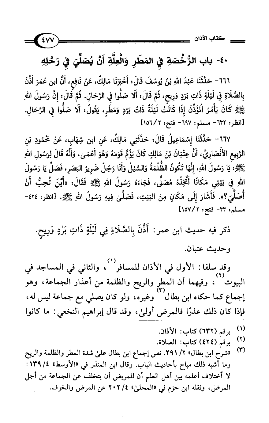 666 - حَدَّثَنَا عَبْدُ اللهِ بْنُ يُوسُفَ قَالَ: أَخْبَرَنَا مَالِكٌ عَنْ نَافِعٍ، أَنَّ ابْنَ عُمَرَ أَذَّنَ بِالصَّلاَةِ فِي لَيْلَةٍ ذَاتِ بَرْدٍ وَرِيحٍ، ثُمَّ قَالَ: أَلاَ صَلُّوا فِي الرِّحَالِ. ثُمَّ قَالَ: إِنَّ رَسُولَ اللهِ - صلى الله عليه وسلم - كَانَ يَأْمُرُ الْمُؤَذِّنَ إِذَا كَانَتْ لَيْلَةٌ ذَاتُ بَرْدٍ وَمَطَرٍ، يَقُولُ: أَلاَ صَلُّوا فِي الرِّحَالِ. [انظر: 632 - مسلم: 697 - فتح: 2/ 156]
