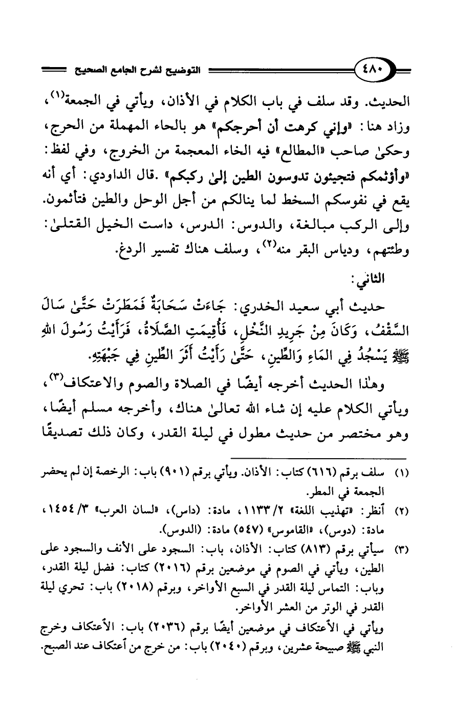 (¬3) سيأتي برقم (813) كتاب: الأذان، باب: السجود على الأنف والسجود على الطين، ويأتي في الصوم في موضعين برقم (2016) كتاب: فضل ليلة القدر، وباب: التماس ليلة القدر في السبع الأواخر، وبرقم (2018) باب: تحري ليلة القدر في الوتر من العشر الأواخر.