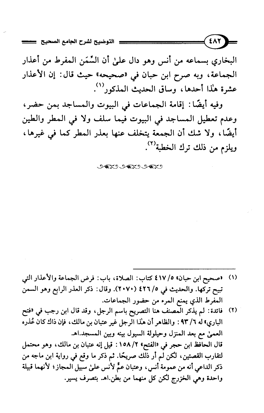 (¬1) "صحيح ابن حبان " 5/ 417 كتاب: الصلاة، باب: فرض الجماعة والأعذار التي تبيح تركها. والحديث في 5/ 426 (2070). وقال: ذكر العذر الرابع وهو السمن المفرط الذي يمنع المرء من حضور الجماعات.