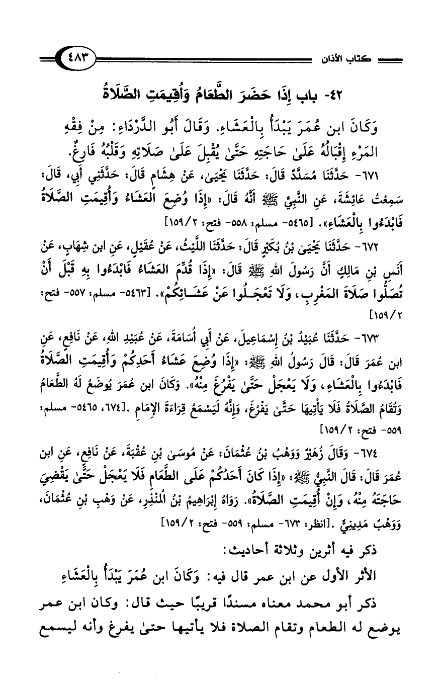 673 - حَدَّثَنَا عُبَيْدُ بْنُ إِسْمَاعِيلَ، عَنْ أَبِي أُسَامَةَ، عَنْ عُبَيْدِ اللهِ، عَنْ نَافِعٍ، عَنِ ابْنِ عُمَرَ قَالَ: قَالَ رَسُولُ اللهِ - صلى الله عليه وسلم -: "إِذَا وُضِعَ عَشَاءُ أَحَدِكُمْ وَأُقِيمَتِ الصَّلاَةُ فَابْدَءُوا بِالْعَشَاءِ، وَلاَ يَعْجَلْ حَتَّى يَفْرُغَ مِنْهُ". وَكَانَ ابْنُ عُمَرَ يُوضَعُ لَهُ الطَّعَامُ وَتُقَامُ الصَّلاَةُ فَلاَ يَأْتِيهَا حَتَّى يَفْرُغَ، وَإِنَّهُ لَيَسْمَعُ قِرَاءَةَ الإِمَامِ. [674، 5465 - مسلم: 559 - فتح: 2/ 159]