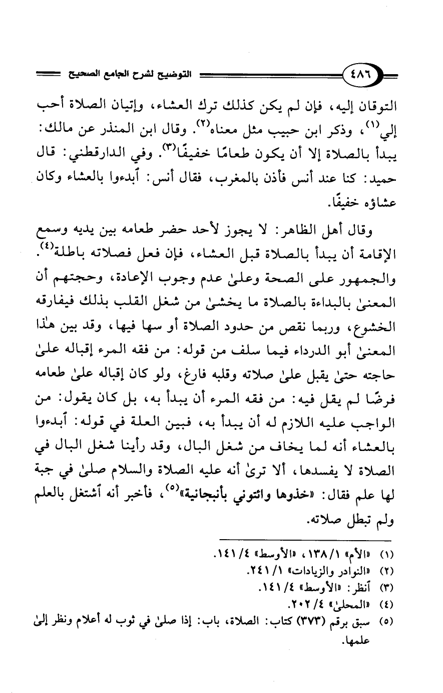 وقال أهل الظاهر: لا يجوز لأحد حضر طعامه بين يديه وسمع الإقامة أن يبدأ بالصلاة قبل العشاء، فإن فعل فصلاته باطلة (¬4).