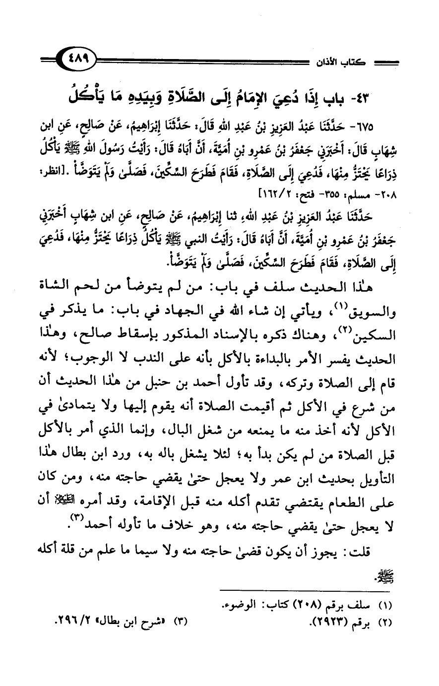 675 - حَدَّثَنَا عَبْدُ الْعَزِيزِ بْنُ عَبْدِ اللهِ قَالَ: حَدَّثَنَا إِبْرَاهِيمُ، عَنْ صَالِحٍ، عَنِ ابْنِ شِهَابٍ قَالَ: أَخْبَرَنِي جَعْفَرُ بْنُ عَمْرِو بْنِ أُمَيَّةَ، أَنَّ أَبَاهُ قَالَ: رَأَيْتُ رَسُولَ اللهِ - صلى الله عليه وسلم - يَأْكُلُ ذِرَاعًا يَحْتَزُّ مِنْهَا، فَدُعِيَ إِلَى الصَّلاَةِ، فَقَامَ فَطَرَحَ السِّكِّينَ، فَصَلَّى وَلَمْ يَتَوَضَّأْ. [انظر: 208 - مسلم: 355 - فتح: 2/ 162]