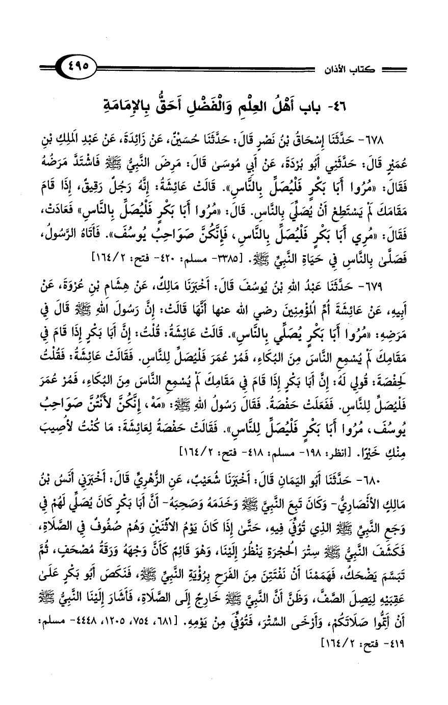 46 - باب أَهْلُ العِلْمِ وَالْفَضْلِ أَحَقُّ بِالإِمَامَةِ