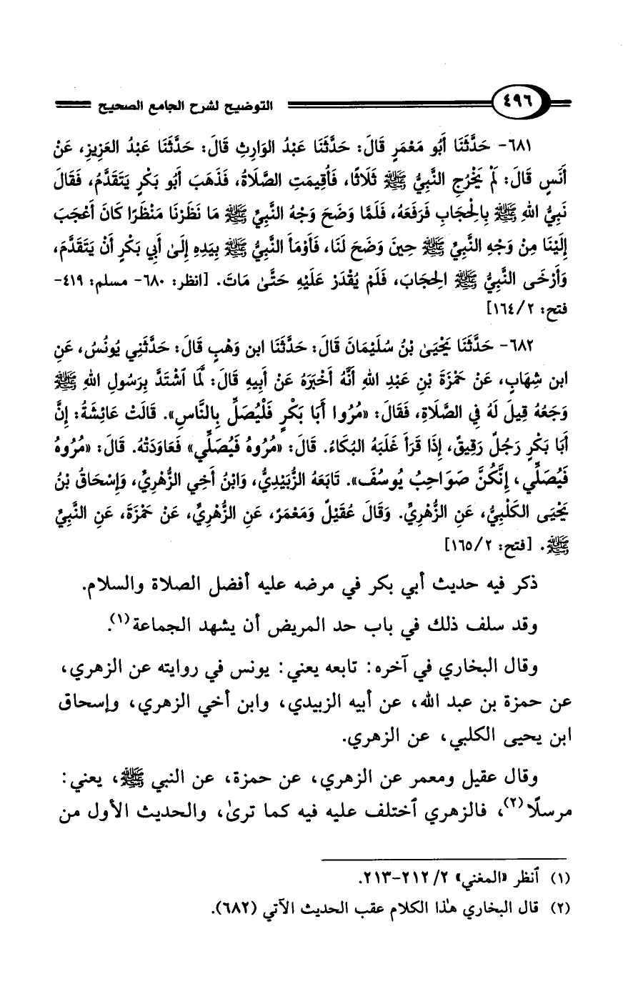 682 - حَدَّثَنَا يَحْيَى بْنُ سُلَيْمَانَ قَالَ: حَدَّثَنَا ابْنُ وَهْبٍ قَالَ: حَدَّثَنِي يُونُسُ، عَنِ ابْنِ شِهَابٍ، عَنْ حَمْزَةَ بْنِ عَبْدِ اللهِ أَنَّهُ أَخْبَرَهُ عَنْ أَبِيهِ قَالَ: لَمَّا اشْتَدَّ بِرَسُولِ اللهِ - صلى الله عليه وسلم - وَجَعُهُ قِيلَ لَهُ فِي الصَّلاَةِ فَقَالَ: "مُرُوا أَبَا بَكْرٍ فَلْيُصَلِّ بِالنَّاسِ". قَالَتْ عَائِشَةُ: إِنَّ أَبَا بَكْرٍ رَجُلٌ رَقِيقٌ، إِذَا قَرَأَ غَلَبَهُ الْبُكَاءُ. قَالَ: "مُرُوهُ فَيُصَلِّي" فَعَاوَدَتْهُ. قَالَ: "مُرُوهُ فَيُصَلِّي، إِنَّكُنَّ صَوَاحِبُ يُوسُفَ". تَابَعَهُ الزُّبَيْدِيُّ، وَابْنُ أَخِي الزُّهْرِيِّ، وَإِسْحَاقُ بْنُ يَحْيَى الْكَلْبِيُّ، عَنِ الزُّهْرِيِّ. وَقَالَ عُقَيْلٌ وَمَعْمَرٌ، عَنِ الزُّهْرِيِّ، عَنْ حَمْزَةَ، عَنِ النَّبِيِّ - صلى الله عليه وسلم -. [فتح: 2/ 165]