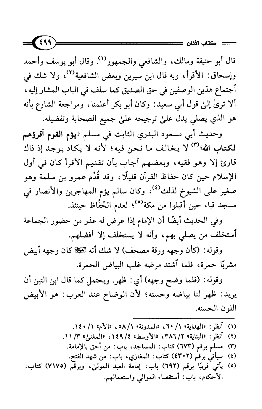 وحديث أبي مسعود البدري الثابت في مسلم "يؤم القوم اقرؤهم لكتاب الله" (¬3) لا يخالف ما نجحن فيه؛ لأنه لا يكاد يوجد إذ ذاك قارئ إلا وهو فقيه، وبعضهم أجاب بأن تقديم الأقرأ كان في أول الإسلام حين كان حفاظ القرآن قليلًا، وقد قُدِّم عمرو بن سلمة وهو صغير على الشيوخ لذلك (¬4)، وكان سالم يؤم المهاجرين والأنصار في مسجد قباء حين أقبلوا من مكة (¬5)؛ لعدم الحُفَّاظ حينئذ.