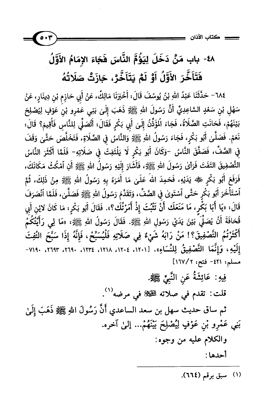 684 - حَدَّثَنَا عَبْدُ اللهِ بْنُ يُوسُفَ قَالَ: أَخْبَرَنَا مَالِكٌ، عَنْ أَبِي حَازِمِ بْنِ دِينَارٍ، عَنْ سَهْلِ بْنِ سَعْدٍ السَّاعِدِيِّ أَنَّ رَسُولَ اللهِ - صلى الله عليه وسلم - ذَهَبَ إِلَى بَنِي عَمْرِو بْنِ عَوْفٍ لِيُصْلِحَ بَيْنَهُمْ، فَحَانَتِ الصَّلاَةُ، فَجَاءَ الْمُؤَذِّنُ إِلَى أَبِي بَكْرٍ فَقَالَ: أَتُصَلِّي لِلنَّاسِ فَأُقِيمَ؟ قَالَ: نَعَمْ. فَصَلَّى أَبُو بَكْرٍ، فَجَاءَ رَسُولُ اللهِ - صلى الله عليه وسلم - وَالنَّاسُ فِي الصَّلاَةِ، فَتَخَلَّصَ حَتَّى وَقَفَ فِي الصَّفِّ، فَصَفَّقَ النَّاسُ -وَكَانَ أَبُو بَكْرٍ لاَ يَلْتَفِتُ فِي صَلاَتِهِ- فَلَمَّا أَكْثَرَ النَّاسُ التَّصْفِيقَ الْتَفَتَ فَرَأَى رَسُولَ اللهِ - صلى الله عليه وسلم -، فَأَشَارَ إِلَيْهِ رَسُولُ اللهِ - صلى الله عليه وسلم - أَنِ امْكُثْ مَكَانَكَ، فَرَفَعَ أَبُو بَكْرٍ - رضى الله عنه - يَدَيْهِ، فَحَمِدَ اللهَ عَلَى مَا أَمَرَهُ بِهِ رَسُولُ اللهِ - صلى الله عليه وسلم - مِنْ ذَلِكَ، ثُمَّ اسْتَأْخَرَ أَبُو بَكْرٍ حَتَّى اسْتَوَى فِي الصَّفِّ، وَتَقَدَّمَ رَسُولُ اللهِ - صلى الله عليه وسلم - فَصَلَّى، فَلَمَّا انْصَرَفَ قَالَ: "يَا أَبَا بَكْرٍ، مَا مَنَعَكَ أَنْ تَثْبُتَ إِذْ أَمَرْتُكَ؟ ". فَقَالَ أَبُو بَكْرٍ: مَا كَانَ لاِبْنِ أَبِي قُحَافَةَ أَنْ يُصَلِّيَ بَيْنَ يَدَىْ رَسُولِ اللهِ - صلى الله عليه وسلم -. فَقَالَ رَسُولُ اللهِ - صلى الله عليه وسلم - "مَا لِي رَأَيْتُكُمْ أَكْثَرْتُمُ التَّصْفِيقَ؟! مَنْ رَابَهُ شَيْءٌ فِي صَلاَتِهِ فَلْيُسَبِّحْ، فَإِنَّهُ إِذَا سَبَّحَ الْتُفِتَ إِلَيْهِ، وَإِنَّمَا التَّصْفِيقُ لِلنِّسَاءِ". [1201، 1204، 1218، 1234، 2690، 2693، 7190 - مسلم: 421 - فتح: 2/ 167]