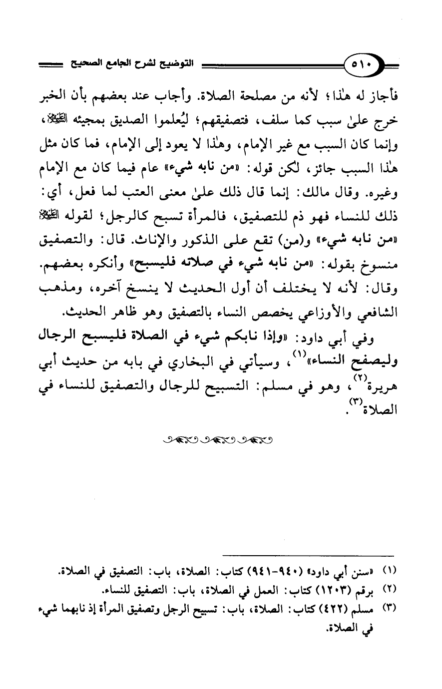(¬1) "سنن أبي داود" (940 - 941) كتاب: الصلاة، باب: التصفيق في الصلاة.