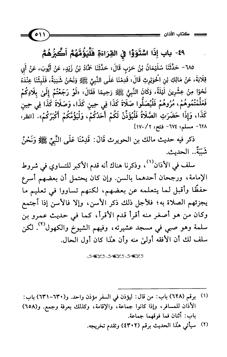 49 - باب إِذَا اسْتَوَوْا فِي القِرَاءَةِ فَلْيَؤُمَّهُمْ أَكْبَرُهُمْ