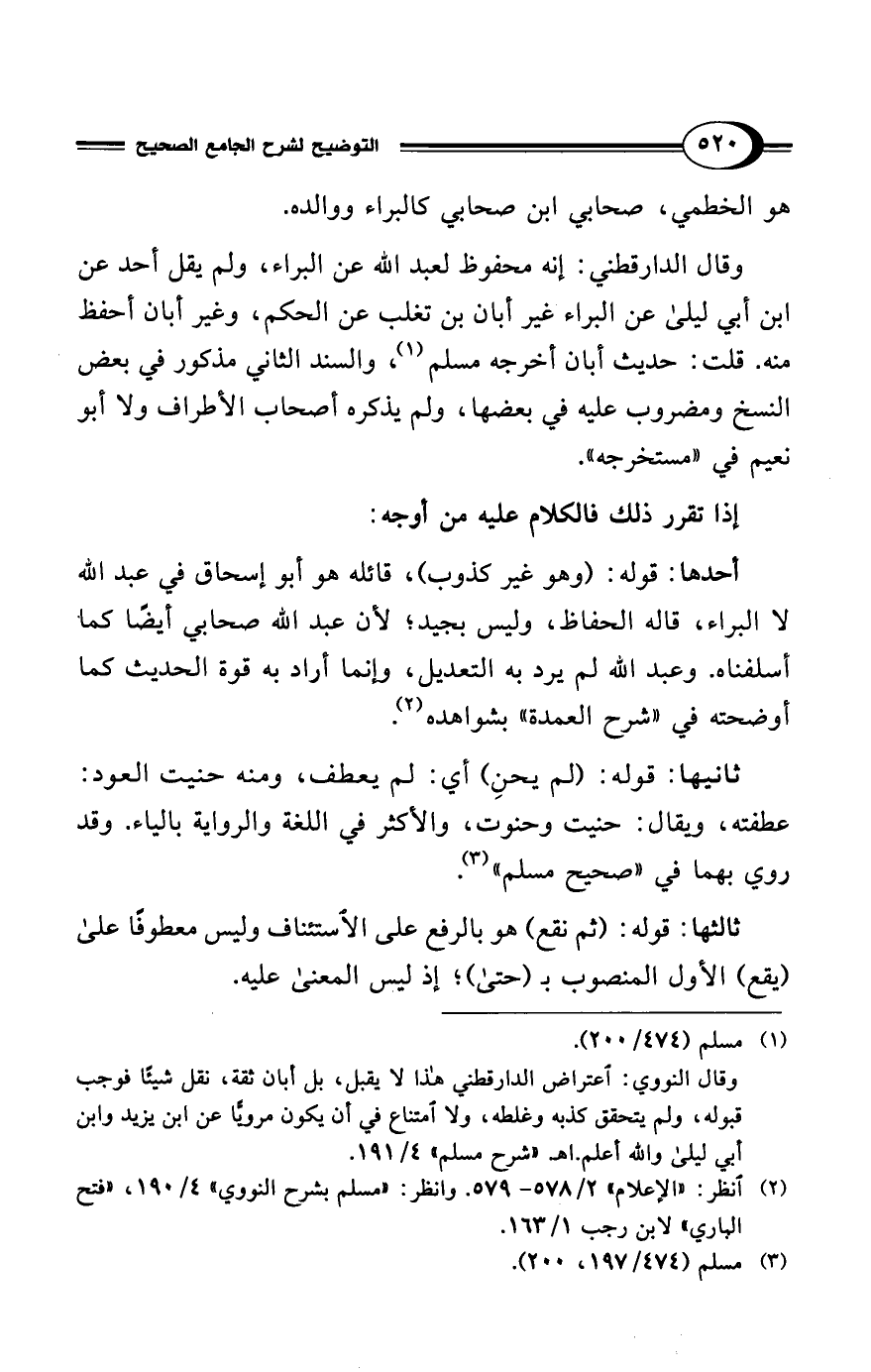 وقال النووي: اعتراض الدارقطني هذا لا يقبل، بل أبان ثقة، نقل شيئًا فوجب قبوله، ولم يتحقق كذبه وغلطه، ولا امتناع في أن يكون مرويًّا عن ابن يزيد وابن أبي ليلى والله اعلم. اهـ. "شرح مسلم" 4/ 191.