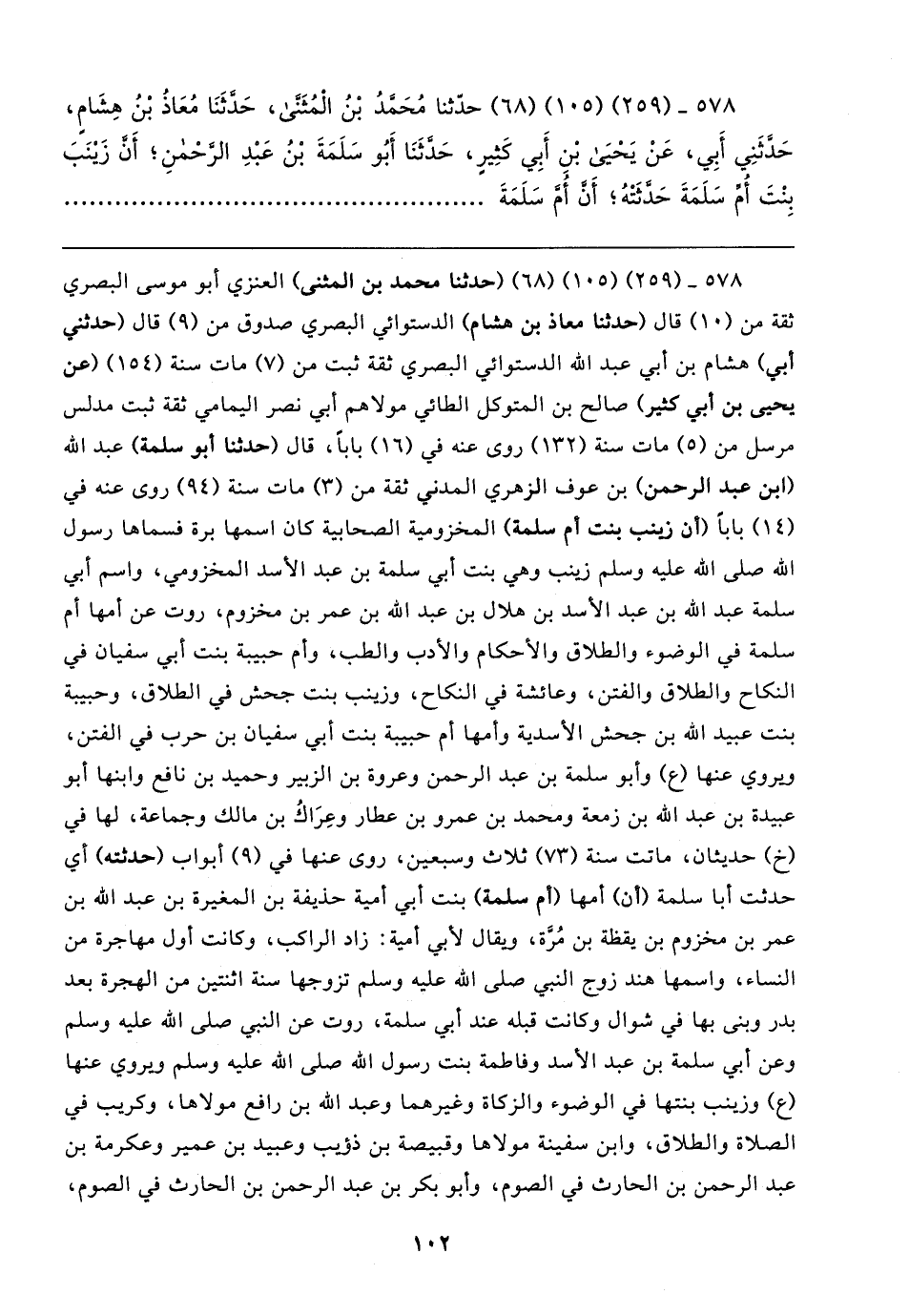 ٥٧٨ - (٢٥٩) (١٠٥) (٦٨) (حدثنا محمَّد بن المثنى) العنزي أبو موسى البصري ثقة من (١٠) قال (حدثنا معاذ بن هشام) الدستوائي البصري صدوق من (٩) قال (حدثني أبي) هشام بن أبي عبد الله الدستوائي البصري ثقة ثبت من (٧) مات سنة (١٥٤) (عن يحيى بن أبي كثير) صالح بن المتوكل الطائي مولاهم أبي نصر اليمامي ثقة ثبت مدلس مرسل من (٥) مات سنة (١٣٢) روى عنه في (١٦) بابا، قال (حدثنا أبو سلمة) عبد الله (ابن عبد الرحمن) بن عوف الزهريّ المدني ثقة من (٣) مات سنة (٩٤) روى عنه في (١٤) بابا (أن زينب بنت أم سلمة) المخزومية الصحابية كان اسمها برة فسماها رسول الله صلى الله عليه وسلم زينب وهي بنت أبي سلمة بن عبد الأسد المخزومي، واسم أبي سلمة عبد الله بن عبد الأسد بن هلال بن عبد الله بن عمر بن مخزوم، روت عن أمها أم سلمة في الوضوء والطلاق والأحكام والأدب والطب، وأم حبيبة بنت أبي سفيان في النكاح والطلاق والفتن، وعائشة في النكاح، وزينب بنت جحش في الطلاق، وحبيبة بنت عبيد الله بن جحش الأسدية وأمها أم حبيبة بنت أبي سفيان بن حرب في الفتن، ويروي عنها (ع) وأبو سلمة بن عبد الرحمن وعروة بن الزبير وحميد بن نافع وابنها أبو عبيدة بن عبد الله بن زمعة ومحمد بن عمرو بن عطار وعِرَاكُ بن مالك وجماعة، لها في (خ) حديثان، ماتت سنة (٧٣) ثلاث وسبعين، روى عنها في (٩) أبواب (حدثته) أي حدثت أبا سلمة (أن) أمها (أم سلمة) بنت أبي أمية حذيفة بن المغيرة بن عبد الله بن عمر بن مخزوم بن يقظة بن مُرَّة، ويقال لأبي أمية: زاد الراكب، وكانت أول مهاجرة من النساء، واسمها هند زوج النبي صلى الله عليه وسلم تزوجها سنة اثنتين من الهجرة بعد بدر وبنى بها في شوال وكانت قبله عند أبي سلمة، روت عن النبي صلى الله عليه وسلم وعن أبي سلمة بن عبد الأسد وفاطمة بنت رسول الله صلى الله عليه وسلم ويروي عنها (ع) وزينب بنتها في الوضوء والزكاة وغيرهما وعبد الله بن رافع مولاها، وكريب في الصلاة والطلاق، وابن سفينة مولاها وقبيصة بن ذؤبب وعبيد بن عمير وعكرمة بن عبد الرحمن بن الحارث في الصوم، وأبو بكر بن عبد الرحمن بن الحارث في الصوم،
