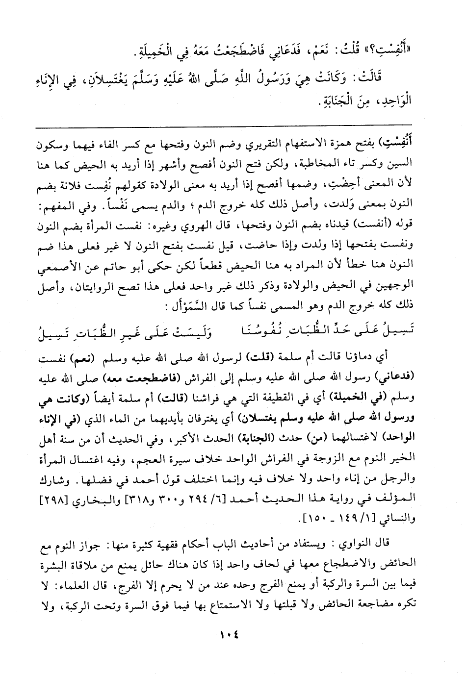قال النواوي: ويستفاد من أحاديث الباب أحكام فقهية كثيرة منها: جواز النوم مع الحائض والاضطجاع معها في لحاف واحد إذا كان هناك حائل يمنع من ملاقاة البشرة فيما بين السرة والركبة أو يمنع الفرج وحده عند من لا يحرم إلا الفرج، قال العلماء: لا تكره مضاجعة الحائض ولا قبلتها ولا الاستمتاع بها فيما فوق السرة وتحت الركبة، ولا