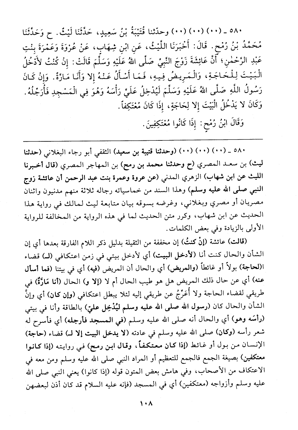 ٥٨٥ - (٠٠) (٠٠) (٠٠) وحدّثنا قُتَيبَةُ بْنُ سَعِيدٍ، حَدَّثَنَا لَيثٌ. ح وَحَدَّثَنَا محمد بْنُ رُمْحٍ. قَال: أَخْبَرَنَا الليثُ، عَنِ ابْنِ شِهَاب، عَنْ عُرْوَةَ وَعَمْرَةَ بِنْتِ عَبْدِ الرَّحْمنِ، أنْ عَائِشَةَ زَوْجَ النبِي صلى اللهُ عَلَيهِ وَسَلَّمَ قَالتْ: إِنْ كُنْتُ لأدخُلُ الْبَيتَ لِلْحَاجَةِ، وَالْمَرِيضُ فِيهِ، فَمَا أَسْأَلُ عَنْهُ إِلا وَأَنَا مَارَّةٌ. وَإِنْ كَانَ رَسُولُ الله صلى اللهُ عَلَيهِ وَسلمَ لَيُدْخِلُ عَلَيَّ رَأْسَهُ وَهُوَ في الْمَسْجِدِ فَأُرَجِّلُهُ. وَكَانَ لا يدخلُ الْبَيتَ إِلا لِحَاجَةٍ، إِذَا كَانَ مُعْتَكِفًا.