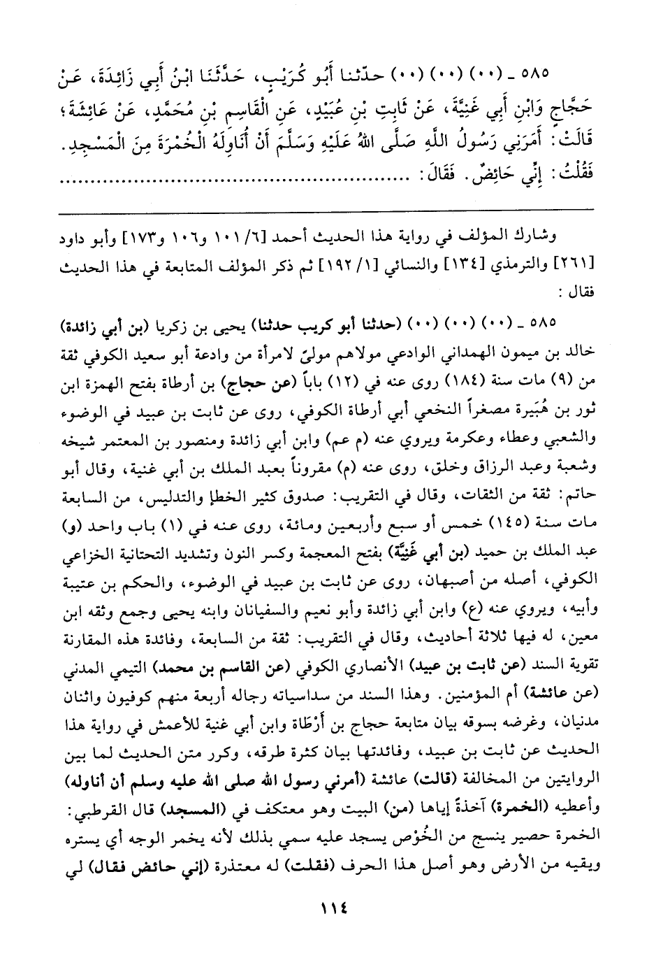 ٥٨٥ - (٠٠) (٠٠) (٠٠) حدثنا أَبُو كُرَيبٍ، حَدَّثَنَا ابْنُ أَبِي زَائِدَةَ، عَنْ حَجَّاجٍ وَابْنِ أبِي غَنِيَّةَ، عَنْ ثَابِتِ بْنِ عُبَيدٍ، عَنِ الْقَاسِمِ بْنِ مُحَمَّدٍ، عَنْ عَائشَةَ؛ قَالتْ: أَمَرَنِي رَسُولُ الله صَلى اللهُ عَلَيهِ وَسلمَ أَنْ أُناولَهُ الْخُمْرَةَ مِنَ الْمَسْجِدِ. فَقُلْتُ: إِني حَائضٌ. فَقَال:
