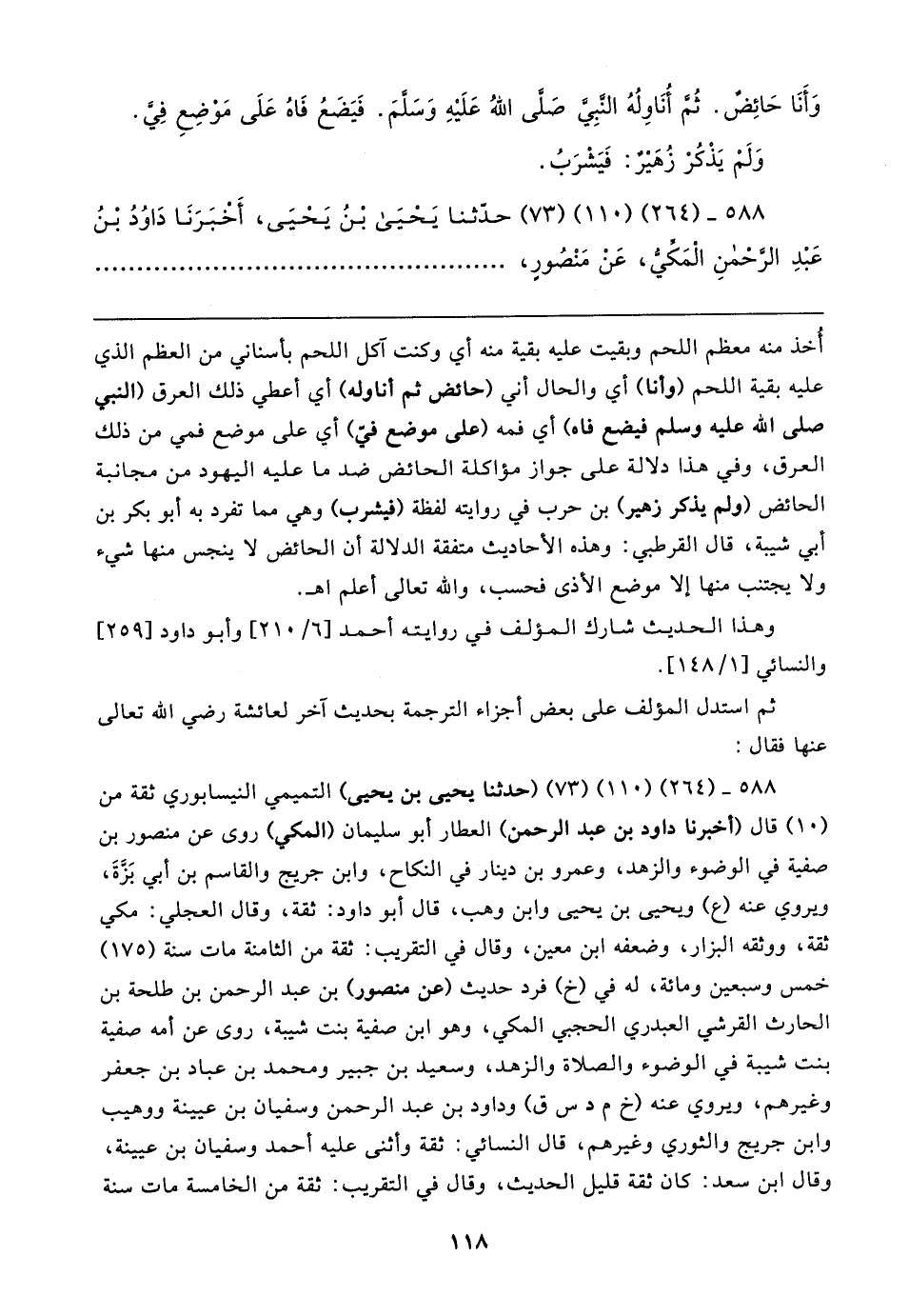 ٥٨٨ - (٢٦٤) (١١٠) (٧٣) (حدثنا يحيى بن يحيى) التميمي النيسابوري ثقة من (١٠) قال (أخبرنا داود بن عبد الرحمن) العطار أبو سليمان (المكي) روى عن منصور بن صفية في الوضوء والزهد، وعمرو بن دينار في النكاح، وابن جريج والقاسم بن أبي بَزَّةَ، ويروي عنه (ع) ويحيى بن يحيى وابن وهب، قال أبو داود: ثقة، وقال العجلي: مكي ثقة، ووثقه البزار، وضعفه ابن معين، وقال في التقريب: ثقة من الثامنة مات سنة (١٧٥) خمس وسبعين ومائة، له في (خ) فرد حديث (عن منصور) بن عبد الرحمن بن طلحة بن الحارث القرشي العبدري الحجبي المكي، وهو ابن صفية بنت شيبة، روى عن أمه صفية بنت شيبة في الوضوء والصلاة والزهد، وسعيد بن جبير ومحمد بن عباد بن جعفر وغيرهم، ويروي عنه (خ م د س ق) وداود بن عبد الرحمن وسفيان بن عيينة ووهيب وابن جريج والثوري وغيرهم، قال النسائي: ثقة وأثنى عليه أحمد وسفيان بن عيينة، وقال ابن سعد: كان ثقة قليل الحديث، وقال في التقريب: ثقة من الخامسة مات سنة