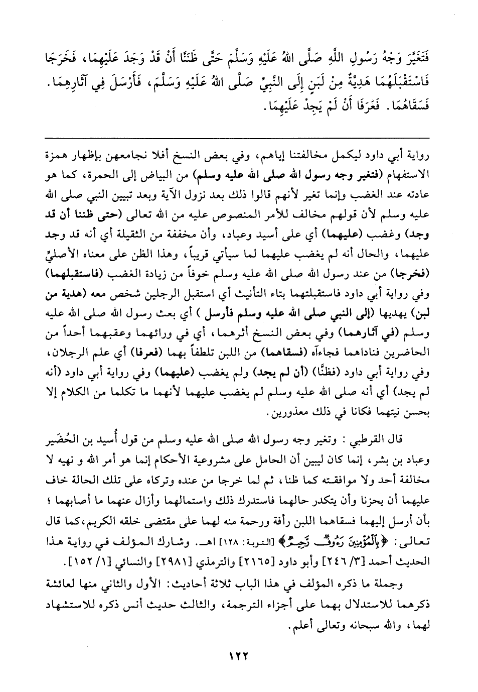 قال القرطبي: وتغير وجه رسول الله صلى الله عليه وسلم من قول أُسيد بن الحُضَير وعباد بن بشر، إنما كان ليبين أن الحامل على مشروعية الأحكام إنما هو أمر الله ونهيه لا مخالفة أحد ولا موافقته كما ظنا، ثم لما خرجا من عنده وتركاه على تلك الحالة خاف عليهما أن يحزنا وأن يتكدر حالهما فاستدرك ذلك واستمالهما وأزال عنهما ما أصابهما؛ بأن أرسل إليهما فسقاهما اللبن رأفة ورحمة منه لهما على مقتضى خلقه الكريم، كما قال تعالى: {بِالْمُؤْمِنِينَ رَءُوفٌ رَحِيمٌ} [التوبة: ١٢٨] اهـ. وشارك المؤلف في رواية هذا الحديث أحمد [٣/ ٢٤٦] وأبو داود [٢١٦٥] والترمذي [٢٩٨١] والنسائي [١/ ١٥٢].