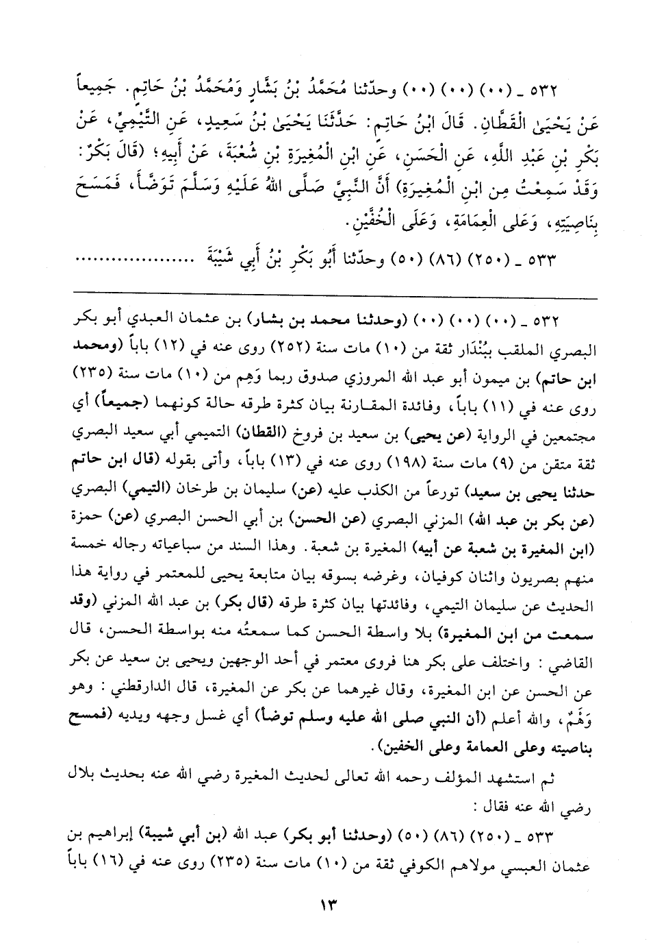 ٥٣٢ - (٠٠) (٠٠) (٠٠) وحدّثنا مُحَمدُ بْنُ بَشَارٍ وَمُحمدُ بْنُ حَاتِمٍ. جَمِيعًا عَنْ يحيى الْقَطَّانِ. قَال ابْنُ حَاتِمٍ: حَدَّثَنَا يحيى بْنُ سَعِيدٍ، عَنِ التيمِيّ، عَنْ بَكْرِ بْنِ عَبْدِ الله، عَنِ الْحَسَنِ، عَنِ ابْنِ الْمُغِيرَةِ بْنِ شُعبَةَ، عَنْ أَبِيهِ؛ (قَال بَكرٌ: وَقَد سَمِعْتُ مِن ابْنِ الْمُغِيرَةِ) أَن النبِي صَلَّى اللهُ عَلَيهِ وَسَلمَ تَوَضأَ، فَمَسَحَ بِنَاصِيَتِهِ، وَعَلى الْعِمَامَةِ، وَعَلَى الْخُفينِ.