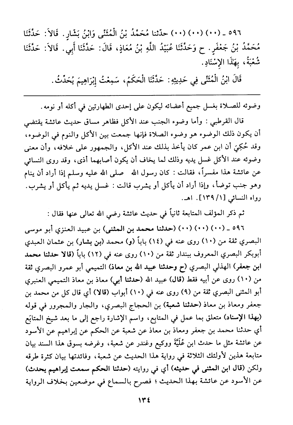 ٥٩٦ - (٠٠) (٠٠) (٠٠) (حدثنا محمد بن المثنى) بن عبيد العنزي أبو موسى البصري ثقة من (١٠) روى عنه في (١٤) بابا (و) محمد (بن بشار) بن عثمان العبدي أبو بكر البصري المعروف ببندار ثقة من (١٠) روى عنه في (١٢) بابا (قالا حدثنا محمد بن جعفر) الهذلي البصري (ح وحدثنا عبيد الله بن معاذ) التميمي أبو عمرو البصري ثقة من (١٠) روى عن أبيه فقط (قال) عبيد الله (حدثنا أبي) معاذ بن معاذ التميمي العنبري أبو المثنى البصري ثقة من (٩) روى عنه في (١٠) أبواب (قالا) أي قال كل من محمد بن جعفر ومعاذ بن معاذ (حدثنا شعبة) بن الحجاج البصري، والجار والمجرور في قوله (بهذا الإسناد) متعلق بما عمل في المتابع، واسم الإشارة راجع إلى ما بعد شيخ المتابَع أي حدثنا محمد بن جعفر ومعاذ بن معاذ عن شعبة عن الحكم عن إبراهيم عن الأسود عن عائشة مثل ما حدث ابن عُلَيَّةَ ووكيع وغندر عن شعبة، وغرضه بسوق هذا السند بيان متابعة هذين لأولئك الثلاثة في رواية هذا الحديث عن شعبة، وفائدتها بيان كثرة طرقه ولكن (قال ابن المثنى في حديثه) أي في روايته (حدثنا الحكم سمعت إبراهيم يحدث) عن الأسود عن عائشة بهذا الحديث؛ فصرح بالسماع في موضعين بخلاف الرواية