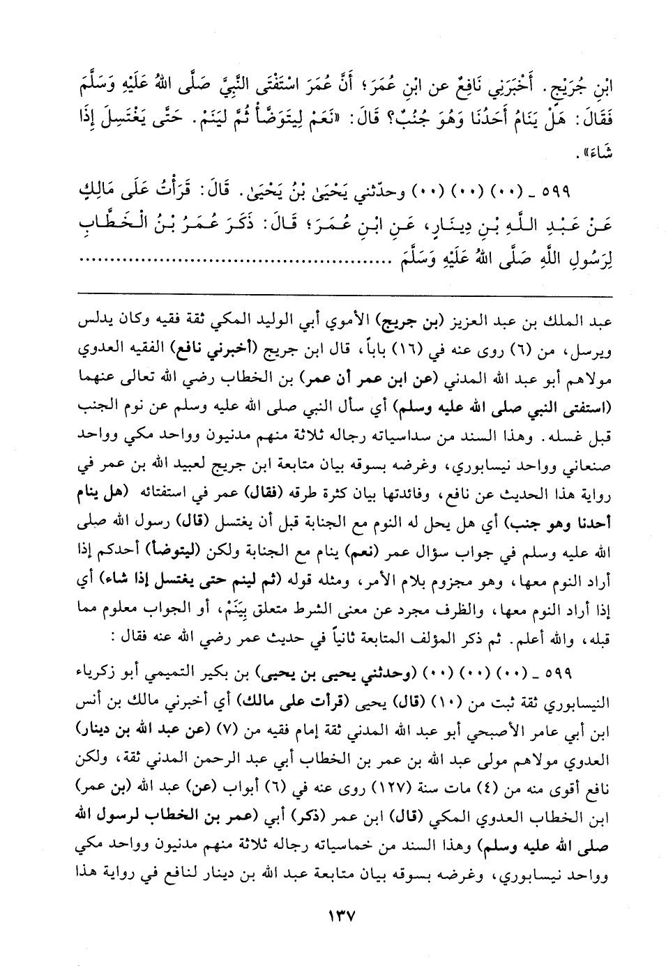 ابْنِ جُرَيجٍ. أَخْبَرَنِي نَافِغ عن ابْنِ عُمَرَ؛ أَنَّ عُمَرَ اسْتَفْتَى النبِي صَلَّى اللهُ عَلَيهِ وَسَلَّمَ فَقَال: هَلْ يَنَامُ أَحَدُنَا وَهُوَ جُنُبٌ؟ قَال: "نَعَمْ لِيتَوَضَّأْ ثُمَّ ليَنَمْ. حَتى يَغْتَسِلَ إِذَا شَاءَ".