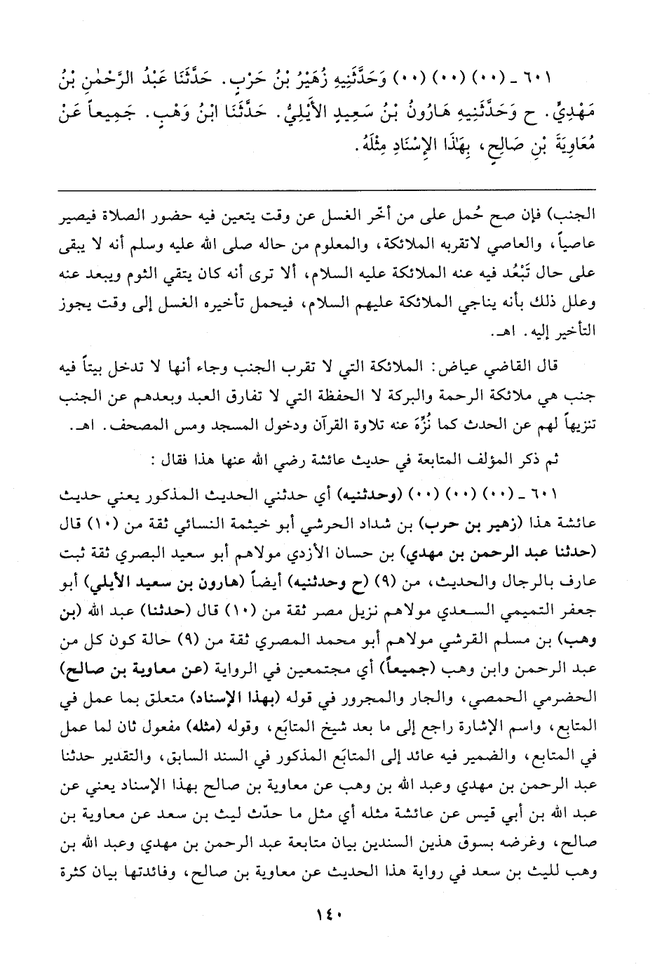 ٦٠١ - (٠٠) (٠٠) (٠٠) (وحدثنيه) أي حدثني الحديث المذكور يعني حديث عائشة هذا (زهير بن حرب) بن شداد الحرشي أبو خيثمة النسائي ثقة من (١٠) قال (حدثنا عبد الرحمن بن مهدي) بن حسان الأزدي مولاهم أبو سعيد البصري ثقة ثبت عارف بالرجال والحديث، من (٩) (ح وحدثنيه) أيضًا (هارون بن سعيد الأيلي) أبو جعفر التميمي السعدي مولاهم نزيل مصر ثقة من (١٠) قال (حدثنا) عبد الله (بن وهب) بن مسلم القرشي مولاهم أبو محمد المصري ثقة من (٩) حالة كون كل من عبد الرحمن وابن وهب (جميعًا) أي مجتمعين في الرواية (عن معاوية بن صالح) الحضرمي الحمصي، والجار والمجرور في قوله (بهذا الإسناد) متعلق بما عمل في المتابع، واسم الإشارة راجع إلى ما بعد شيخ المتابَع، وقوله (مثله) مفعول ثان لما عمل في المتابع، والضمير فيه عائد إلى المتابَع المذكور في السند السابق، والتقدير حدثنا عبد الرحمن بن مهدي وعبد الله بن وهب عن معاوية بن صالح بهذا الإسناد يعني عن عبد الله بن أبي قيس عن عائشة مثله أي مثل ما حذث ليث بن سعد عن معاوية بن صالح، وغرضه بسوق هذين السندين بيان متابعة عبد الرحمن بن مهدي وعبد الله بن وهب لليث بن سعد في رواية هذا الحديث عن معاوية بن صالح، وفائدتها بيان كثرة