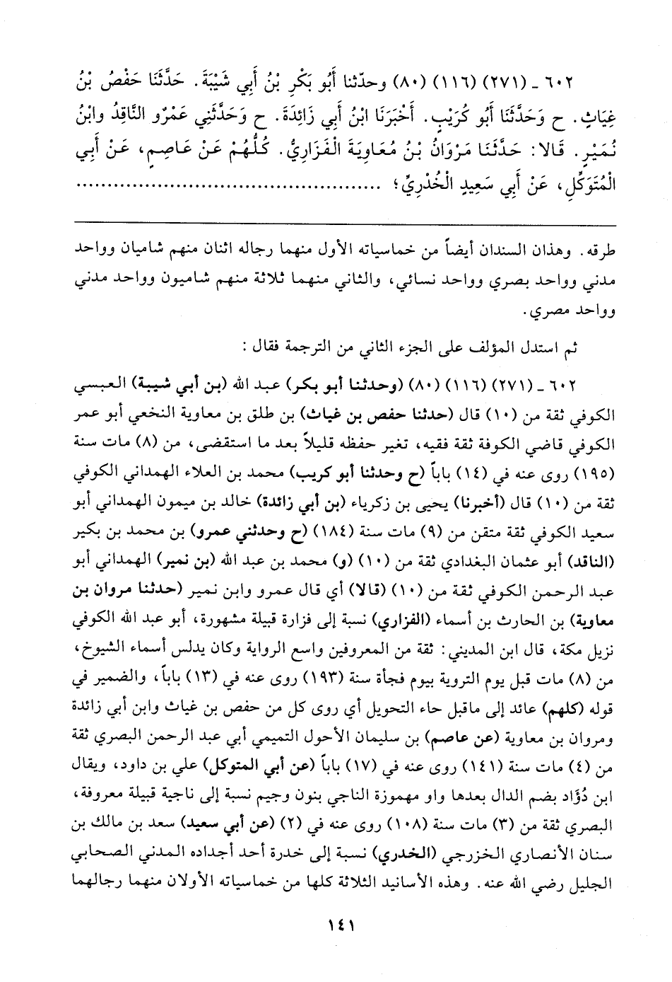 ٦٠٢ - (٢٧١) (١١٦) (٨٠) (وحدثنا أبو بكر) عبد الله (بن أبي شيبة) العبسي الكوفي ثقة من (١٠) قال (حدثنا حفص بن غياث) بن طلق بن معاوية النخعي أبو عمر الكوفي قاضي الكوفة ثقة فقيه، تغير حفظه قليلًا بعد ما استقضى، من (٨) مات سنة (١٩٥) روى عنه في (١٤) بابا (ح وحدثنا أبو كريب) محمد بن العلاء الهمداني الكوفي ثقة من (١٠) قال (أخبرنا) يحيى بن زكرياء (بن أبي زائدة) خالد بن ميمون الهمداني أبو سعيد الكوفي ثقة متقن من (٩) مات سنة (١٨٤) (ح وحدثني عمرو) بن محمد بن بكير (الناقد) أبو عثمان البغدادي ثقة من (١٠) (و) محمد بن عبد الله (بن نمير) الهمداني أبو عبد الرحمن الكوفي ثقة من (١٠) (قالا) أي قال عمرو وابن نمير (حدثنا مروان بن معاوية) بن الحارث بن أسماء (الفزاري) نسبة إلى فزارة قبيلة مشهورة، أبو عبد الله الكوفي نزيل مكة، قال ابن المديني: ثقة من المعروفين واسع الرواية وكان يدلس أسماء الشيوخ، من (٨) مات قبل يوم التروية بيوم فجأة سنة (١٩٣) روى عنه في (١٣) بابا، والضمير في قوله (كلهم) عائد إلى ما قبل حاء التحويل أي روى كل من حفص بن غياث وابن أبي زائدة ومروان بن معاوية (عن عاصم) بن سليمان الأحول التميمي أبي عبد الرحمن البصري ثقة من (٤) مات سنة (١٤١) روى عنه في (١٧) بابا (عن أبي المتوكل) علي بن داود، ويقال ابن دُؤَاد بضم الدال بعدها واو مهموزة الناجي بنون وجيم نسبة إلى ناجية قبيلة معروفة، البصري ثقة من (٣) مات سنة (١٠٨) روى عنه في (٢) (عن أبي سعيد) سعد بن مالك بن سنان الأنصاري الخزرجي (الخدري) نسبة إلى خدرة أحد أجداده المدني الصحابي الجليل رضي الله عنه. وهذه الأسانيد الثلاثة كلها من خماسياته الأولان منهما رجالهما