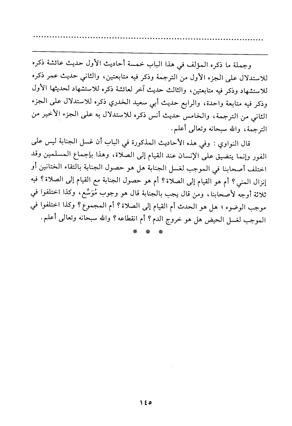 قال النواوي: وفي هذه الأحاديث المذكورة في الباب أن غسل الجنابة ليس على الفور وإنما يتضيق على الإنسان عند القيام إلى الصلاة، وهذا بإجماع المسلمين وقد اختلف أصحابنا في الموجب لغسل الجنابة هل هو حصول الجنابة بالتقاء الختانين أو إنزال المني؟ أم هو القيام إلى الصلاة؟ أم هو حصول الجنابة مع القيام إلى الصلاة؟ فيه ثلاثة أوجه لأصحابنا، ومن قال يجب بالجنابة قال هو وجوب مُوَسَّع، وكذا اختلفوا في موجب الوضوء؛ هل هو الحدث أم القيام إلى الصلاة؟ أم المجموع؟ وكذا اختلفوا في الموجب لغسل الحيض هل هو خروج الدم؟ أم انقطاعه؟ والله سبحانه وتعالى أعلم.