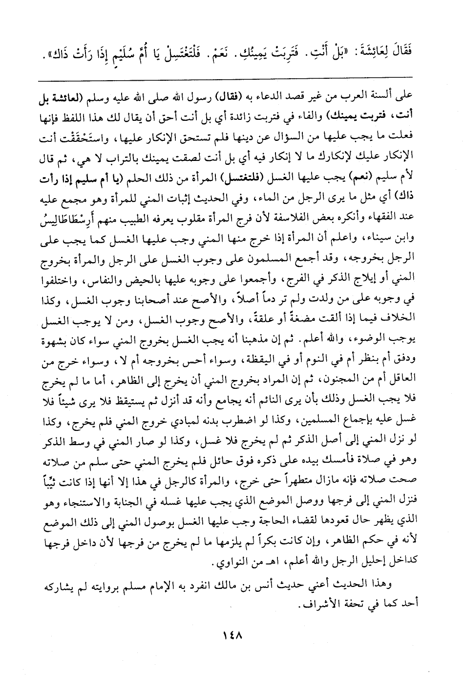 على ألسنة العرب من غير قصد الدعاء به (فقال) رسول الله صلى الله عليه وسلم (لعائشة بل أنت، فتربت يمينك) والفاء في فتربت زائدة أي بل أنت أحق أن يقال لك هذا اللفظ فإنها فعلت ما يجب عليها من السؤال عن دينها فلم تستحق الإنكار عليها، واستَحْقَقْت أنت الإنكار عليك لإنكارك ما لا إنكار فيه أي بل أنت لصقت يمينك بالتراب لا هي، ثم قال لأم سليم (نعم) يجب عليها الغسل (فلتغتسل) المرأة من ذلك الحلم (يا أم سليم إذا رأت ذاك) أي مثل ما يرى الرجل من الماء، وفي الحديث إثبات المني للمرأة وهو مجمع عليه عند الفقهاء وأنكره بعض الفلاسفة لأن فرج المرأة مقلوب يعرفه الطبيب منهم أَرِسْطَاطَالِيسُ وابن سيناء، واعلم أن المرأة إذا خرج منها المني وجب عليها الغسل كما يجب على الرجل بخروجه، وقد أجمع المسلمون على وجوب الغسل على الرجل والمرأة بخروج المني أو إيلاج الذكر في الفرج، وأجمعوا على وجوبه عليها بالحيض والنفاس، واختلفوا في وجوبه على من ولدت ولم تر دمًا أصلًا، والأصح عند أصحابنا وجوب الغسل، وكذا الخلاف فيما إذا ألقت مضغةً أو علقةٌ، والأصح وجوب الغسل، ومن لا يوجب الغسل يوجب الوضوء، والله أعلم. ثم إن مذهبنا أنه يجب الغسل بخروج المني سواء كان بشهوة ودفق أم بنظر أم في النوم أو في اليقظة، وسواء أحس بخروجه أم لا، وسواء خرج من العاقل أم من المجنون، ثم إن المراد بخروج المني أن يخرج إلى الظاهر، أما ما لم يخرج فلا يجب الغسل وذلك بأن يرى النائم أنه يجامع وأنه قد أنزل ثم يستيقظ فلا يرى شيئًا فلا غسل عليه بإجماع المسلمين، وكذا لو اضطرب بدنه لمبادي خروج المني فلم يخرج، وكذا لو نزل المني إلى أصل الذكر ثم لم يخرج فلا غسل، وكذا لو صار المني في وسط الذكر وهو في صلاة فامسك بيده على ذكره فوق حائل فلم يخرج المني حتى سلم من صلاته صحت صلاته فإنه ما زال متطهرًا حتى خرج، والمرأة كالرجل في هذا إلا أنها إذا كانت ثيِّبًا فنزل المني إلى فرجها ووصل الموضع الذي يجب عليها غسله في الجنابة والاستنجاء وهو الذي يظهر حال قعودها لقضاء الحاجة وجب عليها الغسل بوصول المني إلى ذلك الموضع لأنه في حكم الظاهر، وإن كانت بكرًا لم يلزمها ما لم يخرج من فرجها لأن داخل فرجها كداخل إحليل الرجل والله أعلم، اهـ من النواوي.