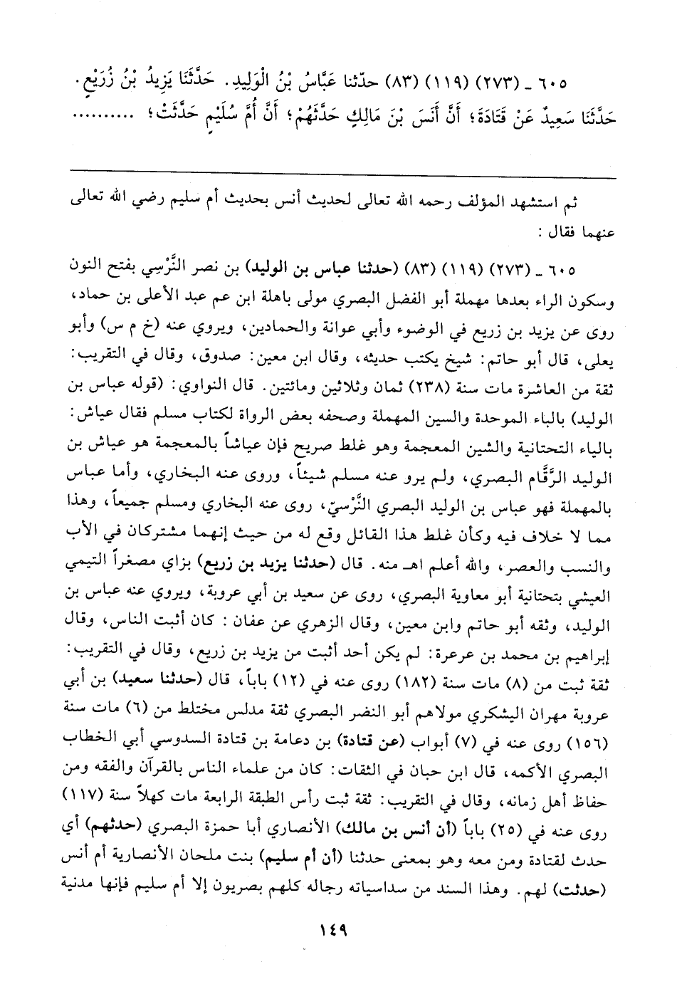 ٦٠٥ - (٢٧٣) (١١٩) (٨٣) (حدثنا عباس بن الوليد) بن نصر النَّرْسِي بفتح النون وسكون الراء بعدها مهملة أبو الفضل البصري مولى باهلة ابن عم عبد الأعلى بن حماد، روى عن يزيد بن زريع في الوضوء وأبي عوانة والحمادين، ويروي عنه (خ م س) وأبو يعلى، قال أبو حاتم: شيخ يكتب حديثه، وقال ابن معين: صدوق، وقال في التقريب: ثقة من العاشرة مات سنة (٢٣٨) ثمان وثلاثين ومائتين. قال النواوي: (قوله عباس بن الوليد) بالباء الموحدة والسين المهملة وصحفه بعض الرواة لكتاب مسلم فقال عياش: بالياء التحتانية والشين المعجمة وهو غلط صريح فإن عياشًا بالمعجمة هو عياش بن الوليد الرَّقَّام البصري، ولم يرو عنه مسلم شيئًا، وروى عنه البخاري، وأما عباس بالمهملة فهو عباس بن الوليد البصري النَّرْسيّ، روى عنه البخاري ومسلم جميعًا، وهذا مما لا خلاف فيه وكان غلط هذا القائل وقع له من حيث إنهما مشتركان في الأب والنسب والعصر، والله أعلم اهـ منه. قال (حدثنا يزيد بن زريع) بزاي مصغرًا التيمي العيشي بتحتانية أبو معاوية البصري، روى عن سعيد بن أبي عروبة، ويروي عنه عباس بن الوليد، وثقه أبو حاتم وابن معين، وقال الزهري عن عفان: كان أثبت الناس، وقال إبراهيم بن محمد بن عرعرة: لم يكن أحد أثبت من يزيد بن زريع، وقال في التقريب: ثقة ثبت من (٨) مات سنة (١٨٢) روى عنه في (١٢) بابا، قال (حدثنا سعيد) بن أبي عروبة مهران اليشكري مولاهم أبو النضر البصري ثقة مدلس مختلط من (٦) مات سنة (١٥٦) روى عنه في (٧) أبواب (عن قتادة) بن دعامة بن قتادة السدوسي أبي الخطاب البصري الأكمه، قال ابن حبان في الثقات: كان من علماء الناس بالقرآن والفقه ومن حفاظ أهل زمانه، وقال في التقريب: ثقة ثبت رأس الطبقة الرابعة مات كهلا سنة (١١٧) روى عنه في (٢٥) بابا (أن أنس بن مالك) الأنصاري أبا حمزة البصري (حدثهم) أي حدث لقتادة ومن معه وهو بمعنى حدثنا (أن أم سليم) بنت ملحان الأنصارية أم أنس (حدثت) لهم. وهذا السند من سداسياته رجاله كلهم بصريون إلا أم سليم فإنها مدنية