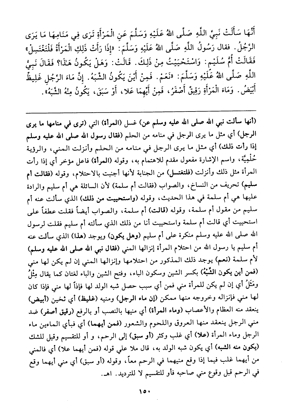أَنَّهَا سَأَلَتْ نَبِيَّ اللهِ صَلَّى اللهُ عَلَيهِ وَسَلَّمَ عَنِ الْمَرْأَةِ تَرَى فِي مَنَامِهَا مَا يَرَى الرَّجُلُ. فقال رَسُولُ اللهِ صَلَّى اللهُ عَلَيهِ وَسَلَّمَ: "إِذَا رَأَتْ ذَلِكِ الْمَرْأَةُ فَلْتَغتَسِلْ" فَقَالتْ أُمُّ سُلَيمٍ: وَاسْتَحْيَيتُ مِنْ ذَلِكَ. قَالت: وَهَلْ يَكُونُ هَذَا؟ فَقَال نَبِيُّ اللهِ صَلَّى اللهُ عَلَيهِ وَسَلَّمَ: "نَعَمْ. فَمِنْ أَينَ يَكُونُ الشَّبَهُ. إِنَّ مَاءَ الرَّجُلِ غَلِيظٌ أَبْيَضُ. وَمَاءَ الْمَرْأةِ رَقِيقٌ أَصْفَرُ، فَمِنْ أَيِّهِمَا عَلا، أَوْ سَبَقَ، يَكُونُ مِنْهُ الشَّبَهُ"