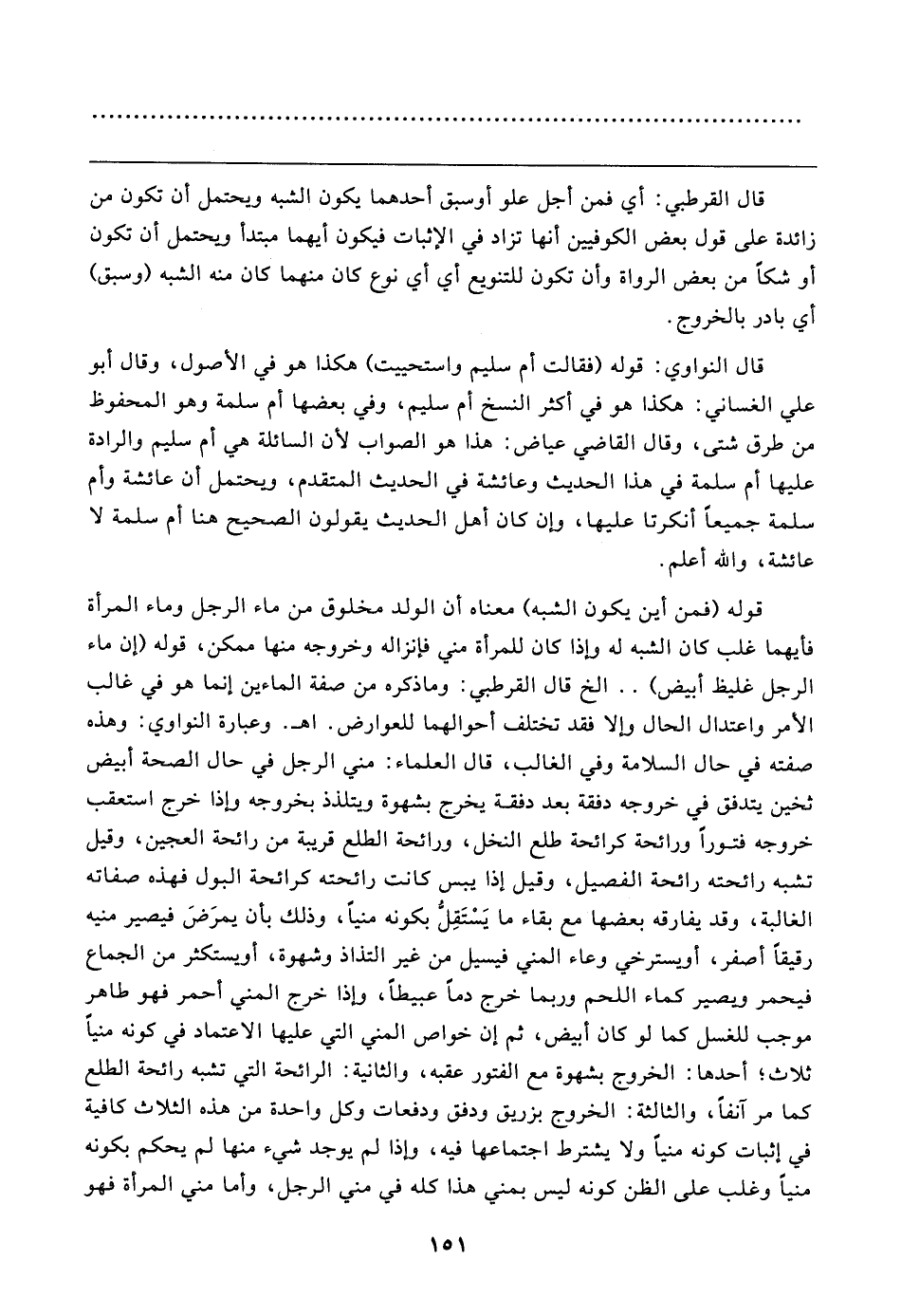 قوله (فمن أين يكون الشبه) معناه أن الولد مخلوق من ماء الرجل وماء المرأة فأيهما غلب كان الشبه له وإذا كان للمرأة مني فإنزاله وخروجه منها ممكن، قوله (إن ماء الرجل غليظ أبيض) .. الخ قال القرطبي: وما ذكره من صفة الماءين إنما هو في غالب الأمر واعتدال الحال وإلا فقد تختلف أحوالهما للعوارض. اهـ. وعبارة النواوي: وهذه صفته في حال السلامة وفي الغالب، قال العلماء: مني الرجل في حال الصحة أبيض ثخين يتدفق في خروجه دفقة بعد دفقة يخرج بشهوة ويتلذذ بخروجه وإذا خرج استعقب خروجه فتورًا ورائحة كرائحة طلع النخل، ورائحة الطلع قريبة من رائحة العجين، وقيل تشبه رائحته رائحة الفصيل، وقيل إذا يبس كانت رائحته كرائحة البول فهذه صفاته الغالبة، وقد يفارقه بعضها مع بقاء ما يَسْتَقِلُّ بكونه منيًّا، وذلك بأن يمرَضَ فيصير منيه رقيقًا أصفر، أو يسترخي وعاء المني فيسيل من غير التذاذ وشهوة، أو يستكثر من الجماع فيحمر ويصير كماء اللحم وربما خرج دمًا عبيطًا، وإذا خرج المني أحمر فهو طاهر موجب للغسل كما لو كان أبيض، ثم إن خواص المني التي عليها الاعتماد في كونه منيًّا ثلاث؛ أحدها: الخروج بشهوة مع الفتور عقبه، والثانية: الرائحة التي تشبه رائحة الطلع كما مر آنفًا، والثالثة: الخروج بزريق ودفق ودفعات وكل واحدة من هذه الثلاث كافية في إثبات كونه منيًّا ولا يشترط اجتماعها فيه، وإذا لم يوجد شيء منها لم يحكم بكونه منيًّا وغلب على الظن كونه ليس بمني هذا كله في مني الرجل، وأما مني المرأة فهو