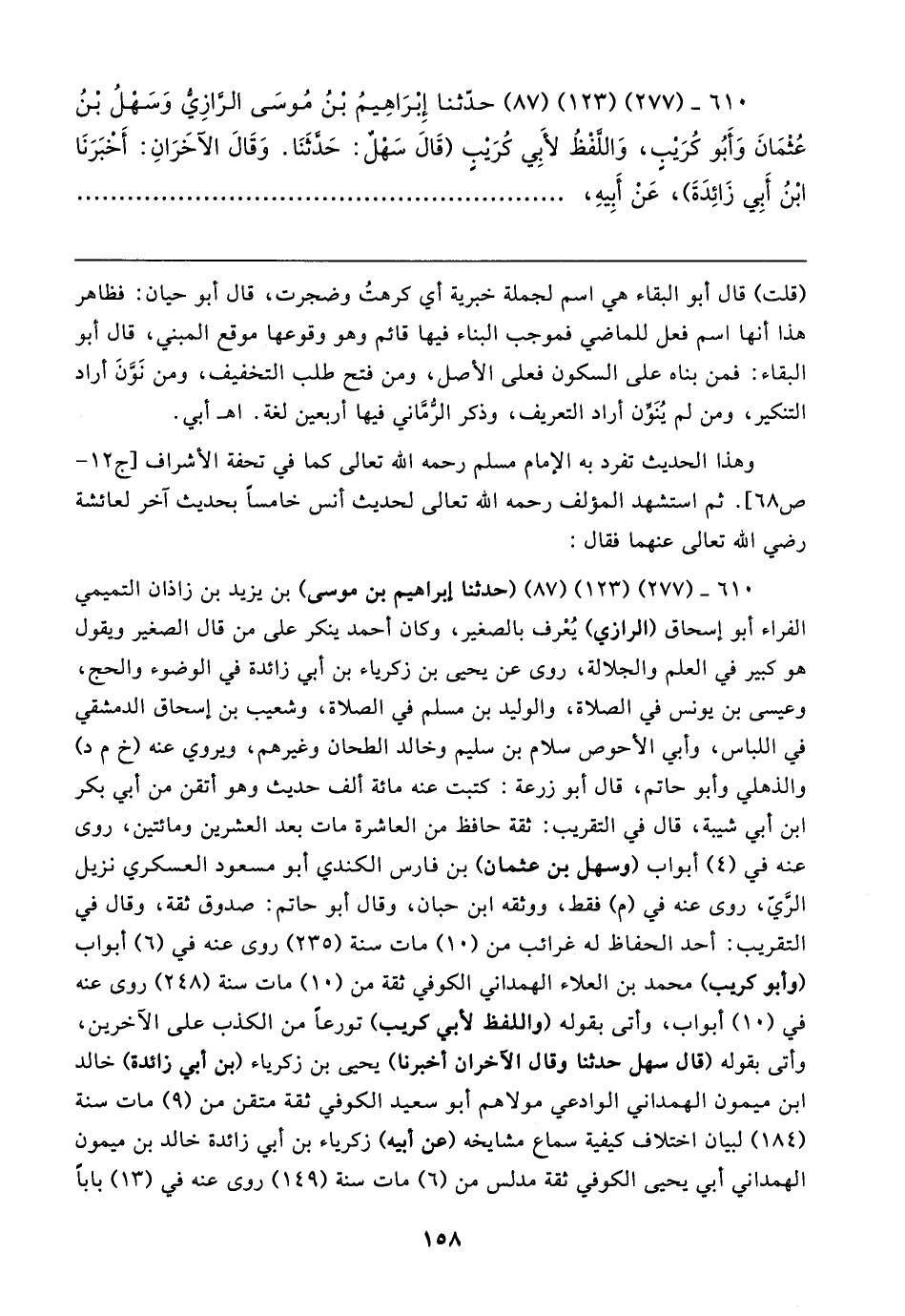 ٦١٠ - (٢٧٧) (١٢٣) (٨٧) (حدثنا إبراهيم بن موسى) بن يزيد بن زاذان التميمي الفراء أبو إسحاق (الرازي) يُعْرف بالصغير، وكان أحمد ينكر على من قال الصغير ويقول هو كبير في العلم والجلالة، روى عن يحيى بن زكرياء بن أبي زائدة في الوضوء والحج، وعيسى بن يونس في الصلاة، والوليد بن مسلم في الصلاة، وشعيب بن إسحاق الدمشقي في اللباس، وأبي الأحوص سلام بن سليم وخالد الطحان وغيرهم، ويروي عنه (خ م د) والذهلي وأبو حاتم، قال أبو زرعة: كتبت عنه مائة ألف حديث وهو أتقن من أبي بكر بن أبي شيبة، قال في التقريب: ثقة حافظ من العاشرة مات بعد العشرين ومائتين، روى عنه في (٤) أبواب (وسهل بن عثمان) بن فارس الكندي أبو مسعود العسكري نزيل الرَّيّ، روى عنه في (م) فقط، ووثقه ابن حبان، وقال أبو حاتم: صدوق ثقة، وقال في التقريب: أحد الحفاظ له غرائب من (١٠) مات سنة (٢٣٥) روى عنه في (٦) أبواب (وأبو كريب) محمد بن العلاء الهمداني الكوفي ثقة من (١٠) مات سنة (٢٤٨) روى عنه في (١٠) أبواب، وأتى بقوله (واللفظ لأبي كريب) تورعًا من الكذب على الآخرين، وأتى بقوله (قال سهل حدثنا وقال الآخران أخبرنا) يحيى بن زكرياء (بن أبي زائدة) خالد بن ميمون الهمداني الوادعي مولاهم أبو سعيد الكوفي ثقة متقن من (٩) مات سنة (١٨٤) لبيان اختلاف كيفية سماع مشايخه (عن أبيه) زكرياء بن أبي زائدة خالد بن ميمون الهمداني أبي يحيى الكوفي ثقة مدلس من (٦) مات سنة (١٤٩) روى عنه في (١٣) بابا