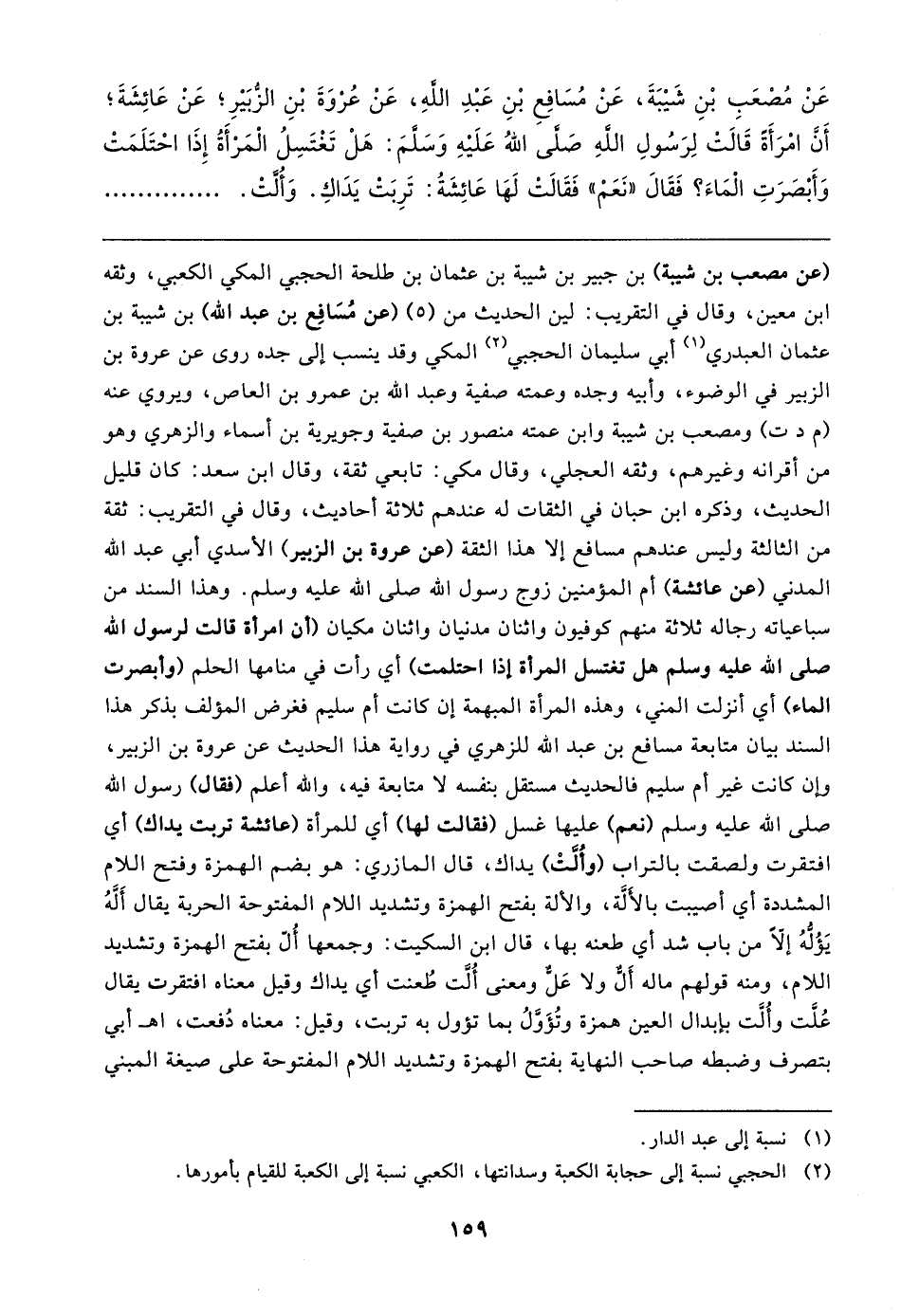 (عن مصعب بن شيبة) بن جبير بن شيبة بن عثمان بن طلحة الحجبي المكي الكعبي، وثقه ابن معين، وقال في التقريب: لين الحديث من (٥) (عن مُسَافِع بن عبد الله) بن شيبة بن عثمان العبدري (١) أبي سليمان الحجبي (٢) المكي وقد ينسب إلى جده روى عن عروة بن الزبير في الوضوء، وأبيه وجده وعمته صفية وعبد الله بن عمرو بن العاص، ويروي عنه (م د ت) ومصعب بن شيبة وابن عمته منصور بن صفية وجويرية بن أسماء والزهري وهو من أقرانه وغيرهم، وثقه العجلي، وقال مكي: تابعي ثقة، وقال ابن سعد: كان قليل الحديث، وذكره ابن حبان في الثقات له عندهم ثلاثة أحاديث، وقال في التقريب: ثقة من الثالثة وليس عندهم مسافع إلا هذا الثقة (عن عروة بن الزبير) الأسدي أبي عبد الله المدني (عن عائشة) أم المؤمنين زوج رسول الله صلى الله عليه وسلم. وهذا السند من سباعياته رجاله ثلاثة منهم كوفيون واثنان مدنيان واثنان مكيان (أن امرأة قالت لرسول الله صلى الله عليه وسلم هل تغتسل المرأة إذا احتلمت) أي رأت في منامها الحلم (وأبصرت الماء) أي أنزلت المني، وهذه المرأة المبهمة إن كانت أم سليم فغرض المؤلف بذكر هذا السند بيان متابعة مسافع بن عبد الله للزهري في رواية هذا الحديث عن عروة بن الزبير، وإن كانت غير أم سليم فالحديث مستقل بنفسه لا متابعة فيه، والله أعلم (فقال) رسول الله صلى الله عليه وسلم (نعم) عليها غسل (فقالت لها) أي للمرأة (عائشة تربت يداك) أي افتقرت ولصقت بالتراب (وأُلَّتْ) يداك، قال المازري: هو بضم الهمزة وفتح اللام المشددة أي أصيبت بالأَلَّة، والألة بفتح الهمزة وتشديد اللام المفتوحة الحربة يقال أَلَّهُ يَؤُلُّهُ إلّا من باب شد أي طعنه بها، قال ابن السكيت: وجمعها أُلّ بفتح الهمزة وتشديد اللام، ومنه قولهم ماله أَلٌّ ولا عَلٌّ ومعنى أُلَّت طُعنت أي يداك وقيل معناه افتقرت يقال عُلَّت وأُلَّت بإبدال العين همزة وتُؤَوَّلُ بما تؤول به تربت، وقيل: معناه دُفعت، اهـ أبي بتصرف وضبطه صاحب النهاية بفتح الهمزة وتشديد اللام المفتوحة على صيغة المبني