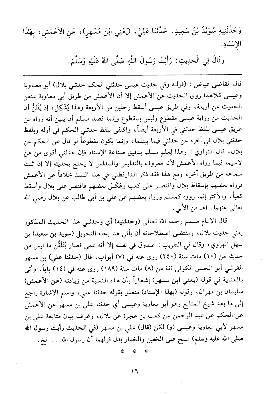 قال الإمام مسلم رحمه الله تعالى (وحدثنيه) أي وحدثني هذا الحديث المذكور يعني حديث بلال، ومقتضى اصطلاحاته أن يأتي هنا بحاء التحويل (سويد بن سعيد) بن سهل الهروي، وقال في التقريب؛ صدوق في نفسه إلا أنه عمي فصار يُتَلَقَّن ما ليس من حديثه من (١٠) مات سنة (٢٤٠) روى عنه في (٧) أبواب، قال (حدثنا علي) بن مسهر القرشي أبو الحسن الكوفي ثقة من (٨) مات سنة (١٨٩) روى عنه في (١٤) بابا، وأتى بالعناية في قوله (يعني ابن مسهر) إشعارًا بأن هذه النسبة من زيادته (عن الأعمش) سليمان بن مهران، وقوله (بهذا الإسناد) متعلق بقوله حدثنا علي، واسم الإشارة راجع إلى ما بعد شيخ المتابع وهو أبو معاوية وعيسى أي حدثنا علي بن مسهر عن الأعمش عن الحكم عن عبد الرحمن عن كعب بن عجرة عن بلال، وغرضه بيان متابعة علي بن مسهر لأبي معاوية وعيسى (و) لكن (قال) علي بن مسهر (في الحديث رأيت رسول الله صلى الله عليه وسلم) مسح على الخفين والخمار بدل قولهما أن رسول الله .. الخ.
