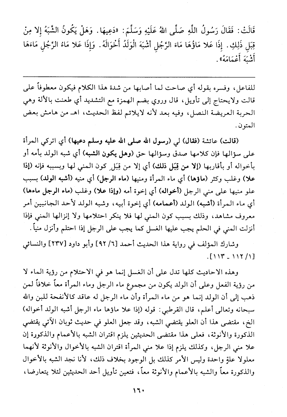 وهذه الأحاديث كلها تدل على أن الغسل إنما هو في الاحتلام من رؤية الماء لا من رؤية الفعل وعلى أن الولد يكون من مجموع ماء الرجل وماء المرأة معًا خلافًا لمن ذهب إلى أن الولد إنما هو من ماء المرأة وأن ماء الرجل له عاقد كالأنفحة للبن والله سبحانه وتعالى أعلم، قال القرطبي: قوله (إذا علا ماؤها ماء الرجل أشبه الولد أخواله) الخ، مقتضى هذا أن العلو يقتضي الشبه، وقد جعل العلو في حديث ثوبان الآتي يقتضي الذكورة والأنوثة، فعلى هذا مقتضى الحديثين يلزم اقتران الشبه بالأعمام والذكورة إن علا مني الرجل، وكذلك يلزم إذا علا مني المرأة اقتران الشبه بالأخوال والأنوثة لأنهما معلولا علةٍ واحدة وليس الأمر كذلك بل الوجود بخلاف ذلك، لأنا نجد الشبه بالأخوال والذكورة معًا والشبه بالأعمام والأنوثة معًا، فتعين تأويل أحد الحديثين لئلا يتعارضا،