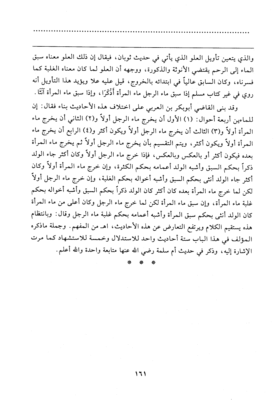 وقد بنى القاضي أبو بكر بن العربي على اختلاف هذه الأحاديث بناء فقال: إن للماءين أربعة أحوال: (١) الأول أن يخرج ماء الرجل أولًا و (٢) الثاني أن يخرج ماء المرأة أولًا و (٣) الثالث أن يخرج ماء الرجل أولًا ويكون أكثر و (٤) الرابع أن يخرج ماء المرأة أولًا ويكون أكثر، ويتم التقسيم بأن يخرج ماء الرجل أولًا ثم يخرج ماء المرأة بعده فيكون أكثر أو بالعكس وبالعكس، فإذا خرج ماء الرجل أولًا وكان أكثر جاء الولد ذكرًا بحكم السبق وأشبه الولد أعمامه بحكم الكثرة، وإن خرج ماء المرأة أولًا وكان أكثر جاء الولد أنثى بحكم السبق وأشبه أخواله بحكم الغلبة، وإن خرج ماء الرجل أولًا لكن لما خرج ماء المرأة بعده كان أكثر كان الولد ذكرًا بحكم السبق وأشبه أخواله بحكم غلبة ماء المرأة، وإن سبق ماء المرأة لكن لما خرج ماء الرجل وكان أعلى من ماء المرأة كان الولد أنثى بحكم سبق المرأة وأشبه أعمامه بحكم غلبة ماء الرجل وقال: وبانتظام هذه يستقيم الكلام ويرتفع التعارض عن هذه الأحاديث، اهـ من المفهم. وجملة ما ذكره المؤلف في هذا الباب ستة أحاديث واحد للاستدلال وخمسة للاسثشهاد كما مرت الإشارة إليه، وذكر في حديث أم سلمة رضي الله عنها متابعة واحدة والله أعلم.