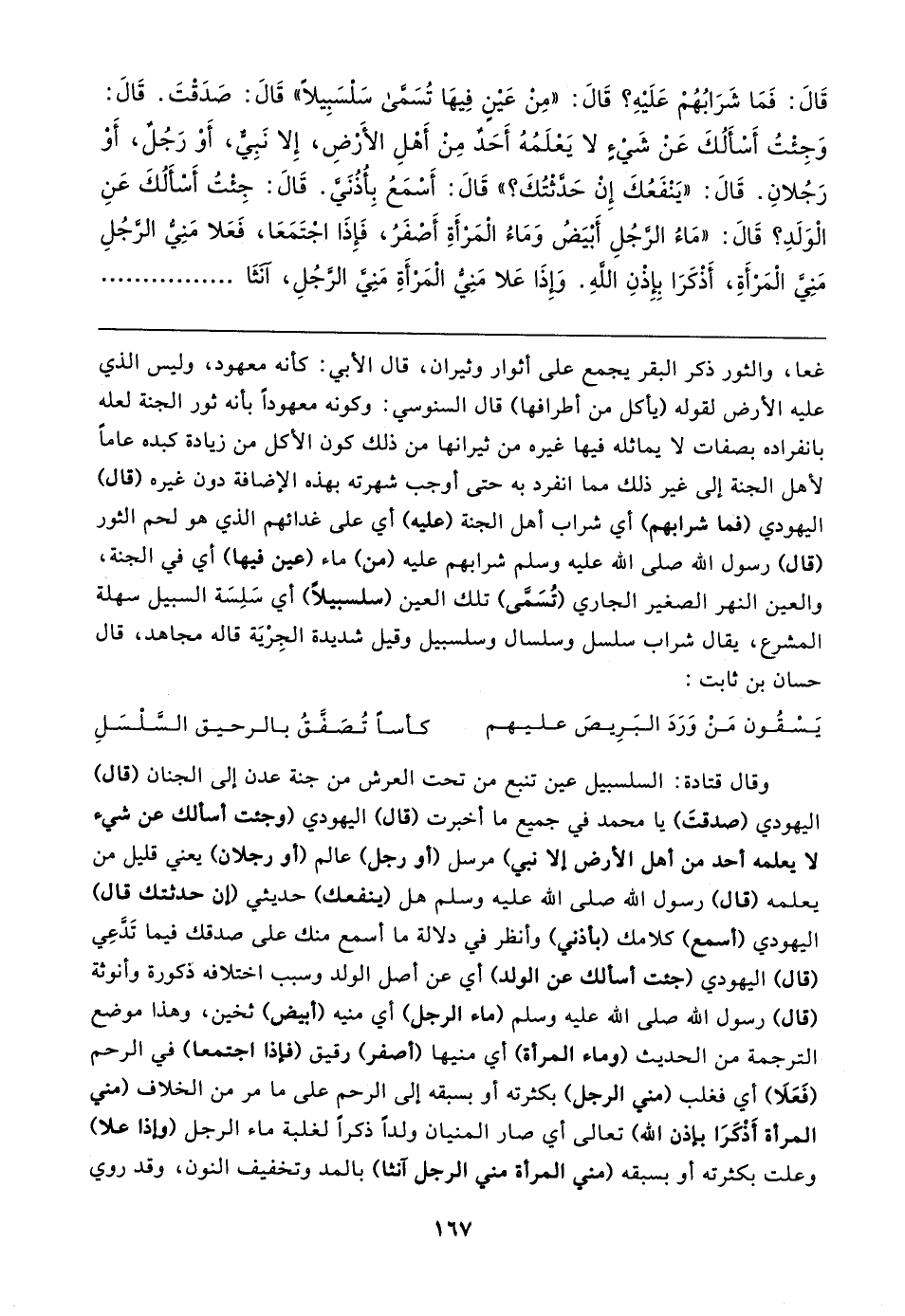 قَال: فَمَا شَرَابُهُمْ عَلَيهِ؟ قَال: "مِنْ عَيني فِيهَا تُسَمَّى سَلْسَبِيلًا" قَال: صَدَقْتَ. قَال: وَجِئْتُ أَسْأَلُكَ عَنْ شَيءٍ لا يَعْلَمُهُ أَحَدٌ مِنْ أَهْلِ الأَرْضِ، إِلا نَبِيٌّ، أَوْ رَجُلٌ، أَوْ رَجُلانِ. قَال: "يَنْفَعُكَ إِنْ حَدَّثتُكَ؟ " قَال: أَسْمَعُ بِأُذُنَيَّ. قَال: جِئْتُ أَسْأَلُكَ عَنِ الْوَلَدِ؟ قَال: "مَاءُ الرَّجُلِ أَبْيَضُ وَمَاءُ الْمَرْأَةِ أَصْفَرُ، فَإِذَا اجتَمَعَا، فَعَلا مَنِيُّ الرَّجُلِ مَنِيَّ الْمَرْأَةِ، أَذْكَرَا بِإِذْنِ اللهِ. وَإِذَا عَلا مَنِى الْمَرْأَةِ مَنِيَّ الرَّجُلِ، آنثَا