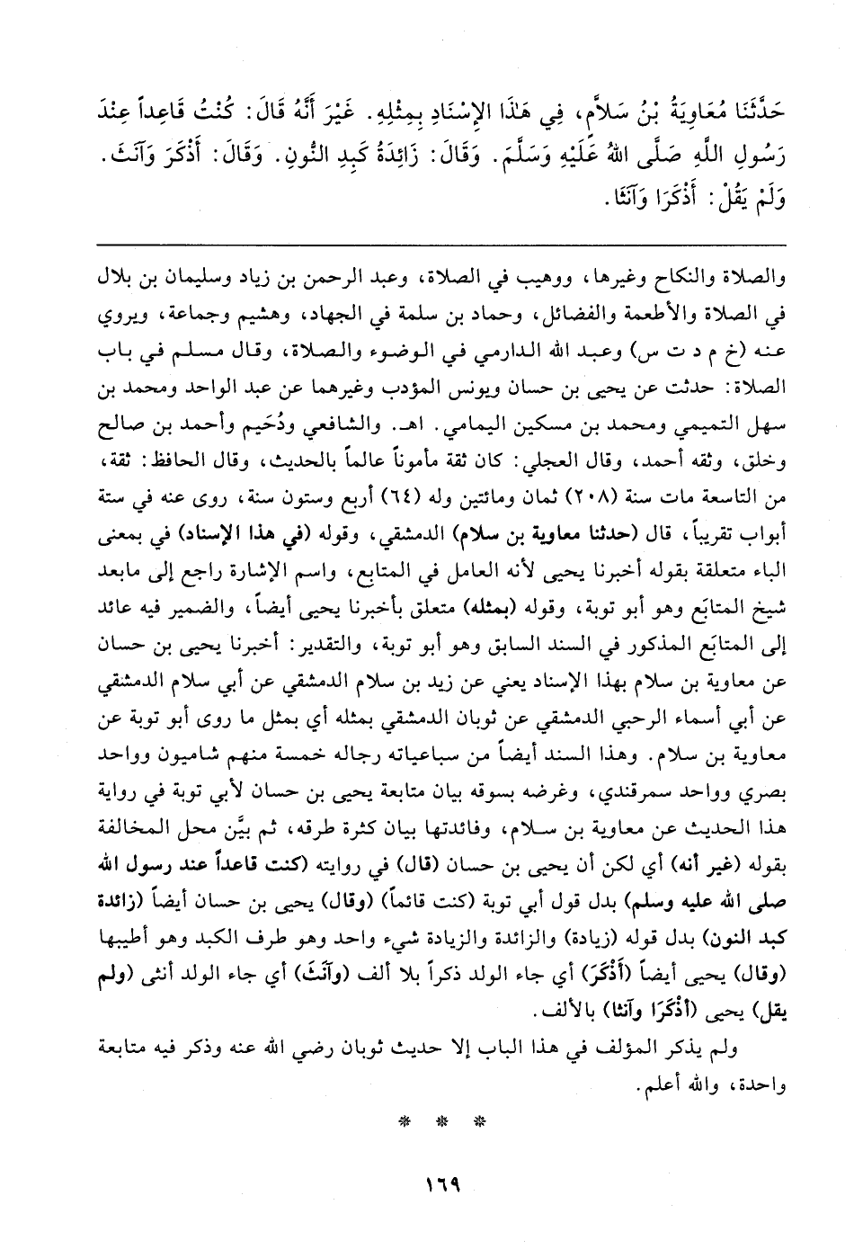 والصلاة والنكاح وغيرها، ووهيب في الصلاة، وعبد الرحمن بن زياد وسليمان بن بلال في الصلاة والأطعمة والفضائل، وحماد بن سلمة في الجهاد، وهشيم وجماعة، ويروي عنه (خ م د ت س) وعبد الله الدارمي في الوضوء والصلاة، وقال مسلم في باب الصلاة: حدثت عن يحيى بن حسان ويونس المؤدب وغيرهما عن عبد الواحد ومحمد بن سهل التميمي ومحمد بن مسكين اليمامي. اهـ. والشافعي ودُحَيم وأحمد بن صالح وخلق، وثقه أحمد، وقال العجلي: كان ثقة مأمونًا عالمًا بالحديث، وقال الحافظ: ثقة، من التاسعة مات سنة (٢٠٨) ثمان ومائتين وله (٦٤) أربع وستون سنة، روى عنه في ستة أبواب تقريبًا، قال (حدثنا معاوية بن سلام) الدمشقي، وقوله (في هذا الإسناد) في بمعنى الباء متعلقة بقوله أخبرنا يحيى لأنه العامل في المتابع، واسم الإشارة راجع إلى مابعد شيخ المتابَع وهو أبو توبة، وقوله (بمثله) متعلق باخبرنا يحيى أيضًا، والضمير فيه عائد إلى المتابَع المذكور في السند السابق وهو أبو توبة، والتقدير: أخبرنا يحيى بن حسان عن معاوية بن سلام بهذا الإسناد يعني عن زيد بن سلام الدمشقي عن أبي سلام الدمشقي عن أبي أسماء الرحبي الدمشقي عن ثوبان الدمشقي بمثله أي بمثل ما روى أبو توبة عن معاوية بن سلام. وهذا السند أيضًا من سباعياته رجاله خمسة منهم شاميون وواحد بصري وواحد سمرقندي، وغرضه بسوقه بيان متابعة يحيى بن حسان لأبي توبة في رواية هذا الحديث عن معاوية بن سلام، وفائدتها بيان كثرة طرقه، ثم بيَّن محل المخالفة بقوله (غير أنه) أي لكن أن يحيى بن حسان (قال) في روايته (كنت قاعدًا عند رسول الله صلى الله عليه وسلم) بدل قول أبي توبة (كنت قائمًا) (وقال) يحيى بن حسان أيضًا (زائدة كبد النون) بدل قوله (زيادة) والزائدة والزيادة شيء واحد وهو طرف الكبد وهو أطيبها (وقال) يحيى أيضًا (أَذْكَرَ) أي جاء الولد ذكرًا بلا ألف (وآنَثَ) أي جاء الولد أنثى (ولم يقل) يحيى (أذْكَرَا وآنثا) بالألف.