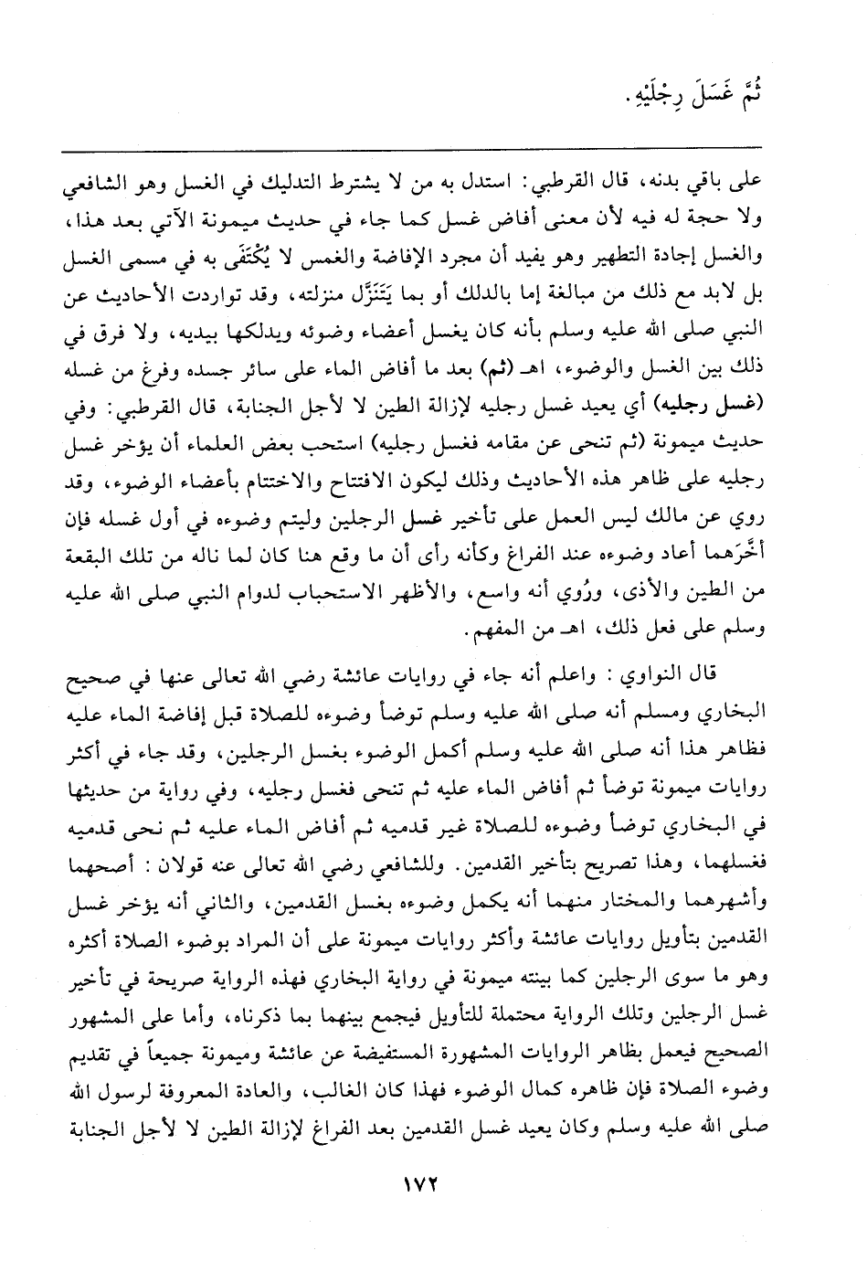 قال النواوي: واعلم أنه جاء في روايات عائشة رضي الله تعالى عنها في صحيح البخاري ومسلم أنه صلى الله عليه وسلم توضأ وضوءه للصلاة قبل إفاضة الماء عليه فظاهر هذا أنه صلى الله عليه وسلم أكمل الوضوء بغسل الرجلين، وقد جاء في أكثر روايات ميمونة توضأ ثم أفاض الماء عليه ثم تنحى فغسل رجليه، وفي رواية من حديثها في البخاري توضأ وضوءه للصلاة غير قدميه ثم أفاض الماء عليه ثم نحى قدميه فغسلهما، وهذا تصريح بتأخير القدمين. وللشافعي رضي الله تعالى عنه قولان: أصحهما وأشهرهما والمختار منهما أنه يكمل وضوءه بغسل القدمين، والثاني أنه يؤخر غسل القدمين بتأويل روايات عائشة وأكثر روايات ميمونة على أن المراد بوضوء الصلاة أكثره وهو ما سوى الرجلين كما بينته ميمونة في رواية البخاري فهذه الرواية صريحة في تأخير غسل الرجلين وتلك الرواية محتملة للتأويل فيجمع بينهما بما ذكرناه، وأما على المشهور الصحيح فيعمل بظاهر الروايات المشهورة المستفيضة عن عائشة وميمونة جميعًا في تقديم وضوء الصلاة فإن ظاهره كمال الوضوء فهذا كان الغالب، والعادة المعروفة لرسول الله صلى الله عليه وسلم وكان يعيد غسل القدمين بعد الفراغ لإزالة الطين لا لأجل الجنابة