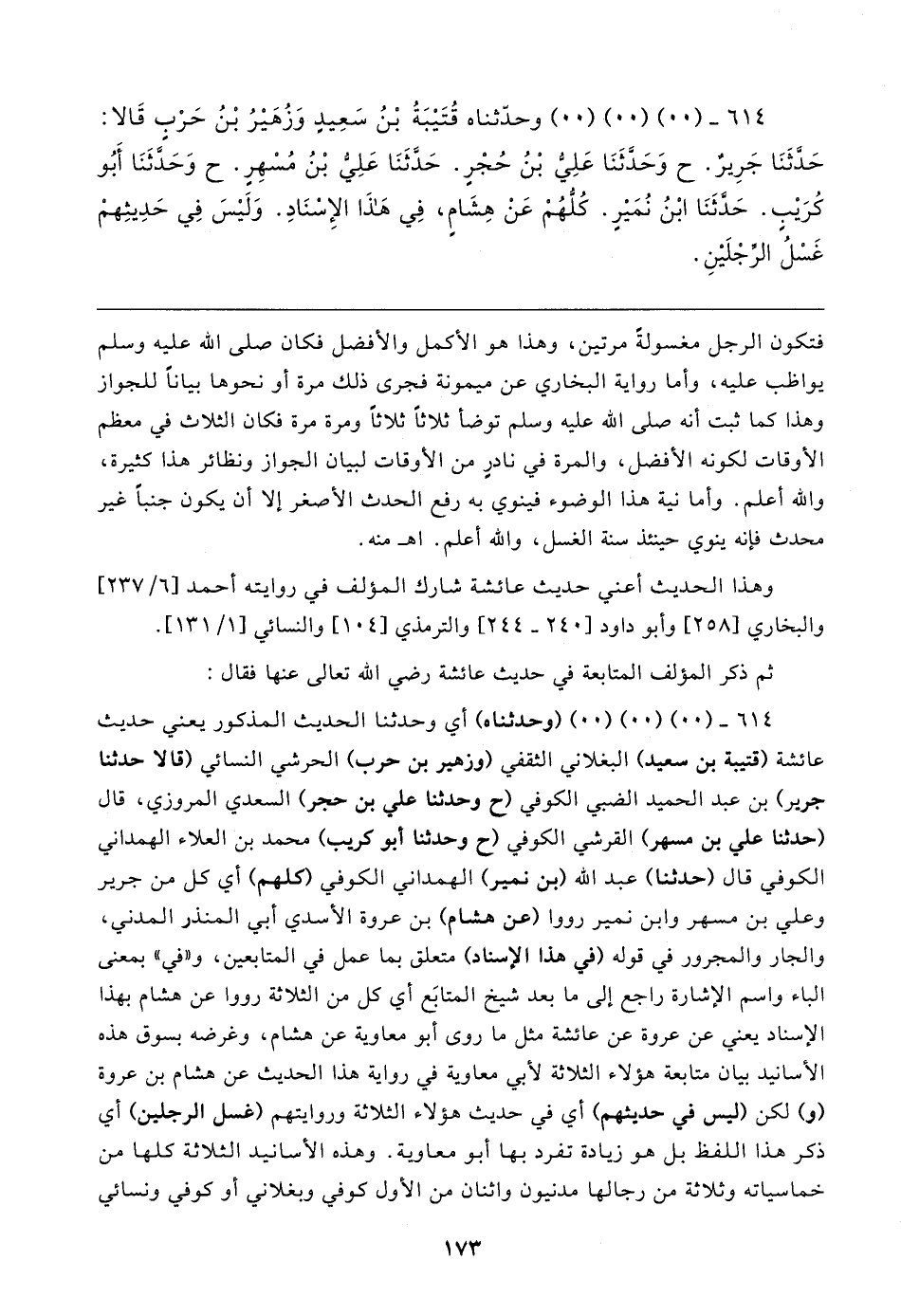 ٦١٤ - (٠٠) (٠٠) (٠٠) (وحدثناه) أي وحدثنا الحديث المذكور يعني حديث عائشة (قتيبة بن سعيد) البغلاني الثقفي (وزهير بن حرب) الحرشي النسائي (قالا حدثنا جرير) بن عبد الحميد الضبي الكوفي (ح وحدثنا علي بن حجر) السعدي المروزي، قال (حدثنا علي بن مسهر) القرشي الكوفي (ح وحدثنا أبو كريب) محمد بن العلاء الهمداني الكوفي قال (حدثنا) عبد الله (بن نمير) الهمداني الكوفي (كلهم) أي كل من جرير وعلي بن مسهر وابن نمير رووا (عن هشام) بن عروة الأسدي أبي المنذر المدني، والجار والمجرور في قوله (في هذا الإسناد) متعلق بما عمل في المتابعين، و"في"بمعنى الباء واسم الإشارة راجع إلى ما بعد شيخ المتابَع أي كل من الثلاثة رووا عن هشام بهذا الإسناد يعني عن عروة عن عائشة مثل ما روى أبو معاوية عن هشام، وغرضه بسوق هذه الأسانيد بيان متابعة هؤلاء الثلاثة لأبي معاوية في رواية هذا الحديث عن هشام بن عروة (و) لكن (ليس في حديثهم) أي في حديث هؤلاء الثلاثة وروايتهم (غسل الرجلين) أي ذكر هذا اللفظ بل هو زيادة تفرد بها أبو معاوية. وهذه الأسانيد الثلاثة كلها من خماسياته وثلاثة من رجالها مدنيون واثنان من الأول كوفي وبغلاني أو كوفي ونسائي