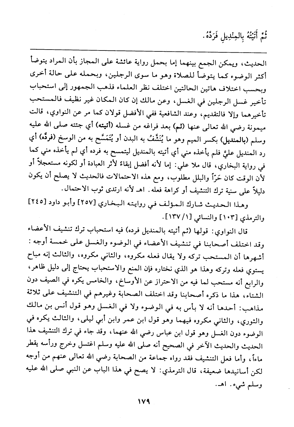 قال النواوي: قولها (ثم أتيته بالمنديل فرده) فيه استحباب ترك تنشيف الأعضاء وقد اختلف أصحابنا في تنشيف الأعضاء في الوضوء والغسل على خمسة أوجه: أشهرها أن المستحب تركه ولا يقال فعله مكروه، والثاني مكروه، والثالث إنه مباح يستوي فعله وتركه وهذا هو الذي نختاره فإن المنع والاستحباب يحتاج إلى دليل ظاهر، والرابع أنه مستحب لما فيه من الاحتراز عن الأوساخ، والخامس يكره في الصيف دون الشتاء، هذا ما ذكره أصحابنا وقد اختلف الصحابة وغيرهم في التنشيف على ثلاثة مذاهب: أحدها أنه لا باس به في الوضوء ولا في الغسل وهو قول أنس بن مالك والثوري، والثاني مكروه فيهما وهو قول ابن عمر وابن أبي ليلى، والثالث يكره في الوضوء دون الغسل وهو قول ابن عباس رضي الله عنهما، وقد جاء في ترك التنشيف هذا الحديث والحديث الآخر في الصحيح أنه صلى الله عليه وسلم اغتسل وخرج ورأسه يقطر ماءا، وأما فعل التنشيف فقد رواه جماعة من الصحابة رضي الله تعالى عنهم من أوجه لكن أسانيدها ضعيفة، قال الترمذي: لا يصح في هذا الباب عن النبي صلى الله عليه وسلم شيء. اهـ.