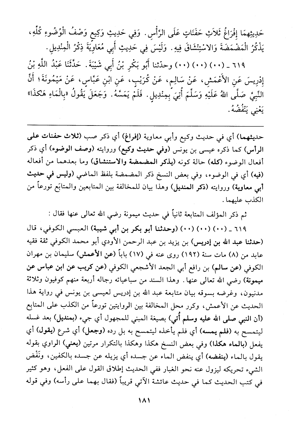 ٦١٩ - (٠٠) (٠٠) (٠٠) (وحدثنا أبو بكر بن أبي شيبة) العبسي الكوفي، قال (حدثنا عبد الله بن إدريس) بن يزيد بن عبد الرحمن الأودي أبو محمد الكوفي ثقة فقيه عابد من (٨) مات سنة (١٩٢) روى عنه في (١٧) بابا (عن الأعمش) سليمان بن مهران الكوفي (عن سالم) بن رافع أبي الجعد الأشجعي الكوفي (عن غريب عن ابن عباس عن ميمونة) رضي الله تعالى عنها. وهذا السند من سباعياته رجاله أربعة منهم كوفيون وثلاثة مدنيون، وغرضه بسوقه بيان متابعة عبد الله بن إدريس لعيسى بن يونس في رواية هذا الحديث عن الأعمش، وكرر محل المخالفة بين الروايتين تورعًا من الكذب على المتابع (أن النبي صلى الله عليه وسلم أتي) بصيغة المبني للمجهول أي جيء (بمنديل) بعد غسله ليتمسح به (فلم يمسه) أي فلم يأخذه ليتمسح به بل رده (وجعل) أي شرع (يقول) أي يفعل (بالماء هكذا) وفي بعض النسخ هكذا وهكذا بالتكرار مرتين (يعني) الراوي بقوله يقول بالماء (ينفضه) أي ينفض الماء عن جسده أي يزيله عن جسده بالكفين، ونَفْض الشيء تحريكه ليزول عنه نحو الغبار ففي الحديث إطلاق القول على الفعل، وهو كثير في كتب الحديث كما في حديث عائشة الآتي قريبًا (فقال بهما على رأسه) وفي قوله