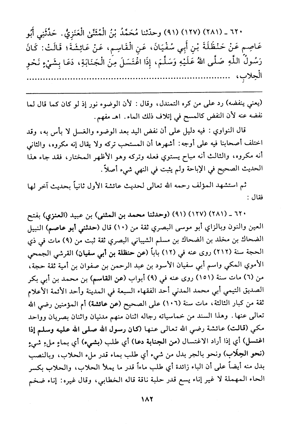 ٦٢٠ - (٢٨١) (١٢٧) (٩١) (وحدثنا محمد بن المثنى) بن عبيد (العنزي) بفتح العين والنون وبالزاي أبو موسى البصري ثقة من (١٠) قال (حدثني أبو عاصم) النبيل الضحاك بن مخلد بن الضحاك بن مسلم الشيباني البصري ثقة ثبت من (٩) مات في ذي الحجة سنة (٢١٢) روى عنه في (١٢) بابا (عن حنظلة بن أبي سفيان) القرشي الجمحي الأموي المكي واسم أبي سفيان الأسود بن عبد الرحمن بن صفوان بن أمية ثقة حجة، من (٦) مات سنة (١٥١) روى عنه في (٩) أبواب (عن القاسم) بن محمد بن أبي بكر الصديق التيمي أبي محمد المدني أحد الفقهاء السبعة في المدينة وأحد الأئمة الأعلام ثقة من كبار الثالثة، مات سنة (١٠٦) على الصحيح (عن عائشة) أم المؤمنين رضي الله تعالى عنها. وهذا السند من خماسياته رجاله اثنان منهم مدنيان واثنان بصريان وواحد مكي (قالت) عائشة رضي الله تعالى عنها كان رسول الله صلى الله عليه وسلم إذا اغتسل) أي إذا أراد الاغتسال (من الجنابة دعا) أي طلب (بشيء) أي بماءٍ ملءِ شيءٍ (نحو الحِلَاب) ونحو بالجر بدل من شيء أي طلب بماء قدر ملء الحلاب، وبالنصب بدل منه أيضًا على أن الباء زائدة أي طلب ماءًا قدر ما يملأ الحلاب، والحلاب بكسر الحاء المهملة لا غير إناء يسع قدر حلبة ناقة قاله الخطابي، وقال غيره: إناء ضخم