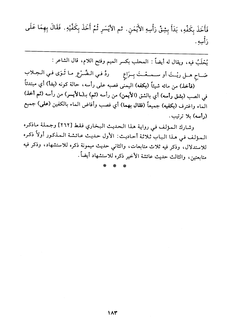 فَأَخَذ بِكَفِّهِ، بَدَأَ بِشِق رَأْسِهِ الأَيمَنِ. ثم الأيسَرِ ثُمَّ أَخَذَ بِكَفيهِ. فَقَال بِهِمَا عَلَى رَأْسِهِ