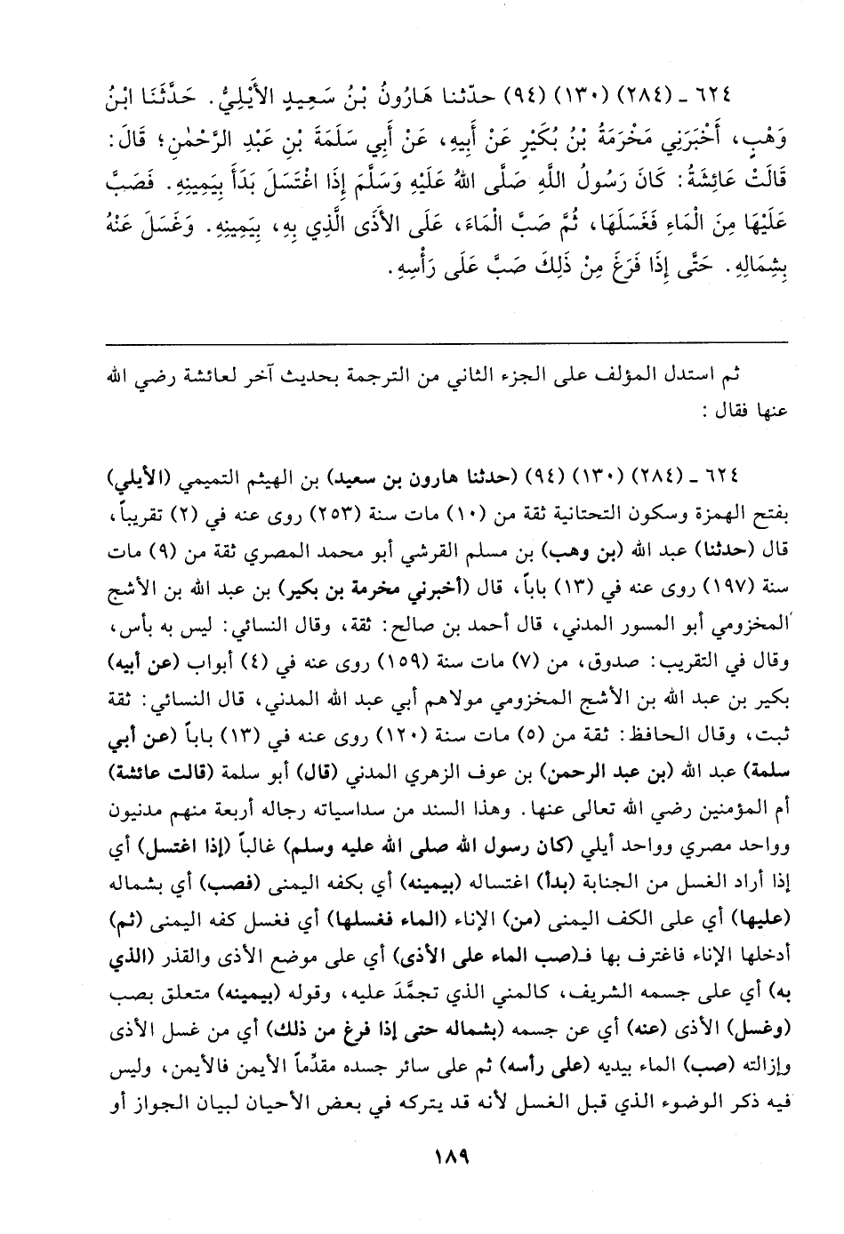 ٦٢٤ - (٢٨٤) (١٣٠) (٩٤) (حدثنا هارون بن سعيد) بن الهيثم التميمي (الأيلي) بفتح الهمزة وسكون التحتانية ثقة من (١٠) مات سنة (٢٥٣) روى عنه في (٢) تقريبًا، قال (حدثنا) عبد الله (بن وهب) بن مسلم القرشي أبو محمد المصري ثقة من (٩) مات سنة (١٩٧) روى عنه في (١٣) بابا، قال (أخبرني مخرمة بن بكير) بن عبد الله بن الأشج "المخزومي أبو المسور المدني، قال أحمد بن صالح: ثقة، وقال النسائي: ليس به بأس، وقال في التقريب: صدوق، من (٧) مات سنة (١٥٩) روى عنه في (٤) أبواب (عن أبيه) بكير بن عبد الله بن الأشج المخزومي مولاهم أبي عبد الله المدني، قال النسائي: ثقة ثبت، وقال الحافظ: ثقة من (٥) مات سنة (١٢٠) روى عنه في (١٣) بابا (عن أبي سلمة) عبد الله (بن عبد الرحمن) بن عوف الزهري المدني (قال) أبو سلمة (قالت عائشة) أم المؤمنين رضي الله تعالى عنها. وهذا السند من سداسياته رجاله أربعة منهم مدنيون وواحد مصري وواحد أيلي (كان رسول الله صلى الله عليه وسلم) غالبًا (إذا اغتسل) أي إذا أراد الغسل من الجنابة (بدأ) اغتساله (بيمينه) أي بكفه اليمنى (فصب) أي بشماله (عليها) أي على الكف اليمنى (من) الإناء (الماء فغسلها) أي فغسل كفه اليمنى (ثم) أدخلها الإناء فاغترف بها فـ (صب الماء على الأذى) أي على موضع الأذى والقذر (الَّذي به) أي على جسمه الشريف، كالمني الَّذي تجمَّدَ عليه، وقوله (بيمينه) متعلق بصب (وغسل) الأذى (عنه) أي عن جسمه (بشماله حتَّى إذا فرغ من ذلك) أي من غسل الأذى وإزالته (صب) الماء بيديه (على رأسه) ثم على سائر جسده مقدَّمًا الأيمن فالأيمن، وليس فيه ذكر الوضوء الَّذي قبل الغسل لأنه قد يتركه في بعض الأحيان لبيان الجواز أو