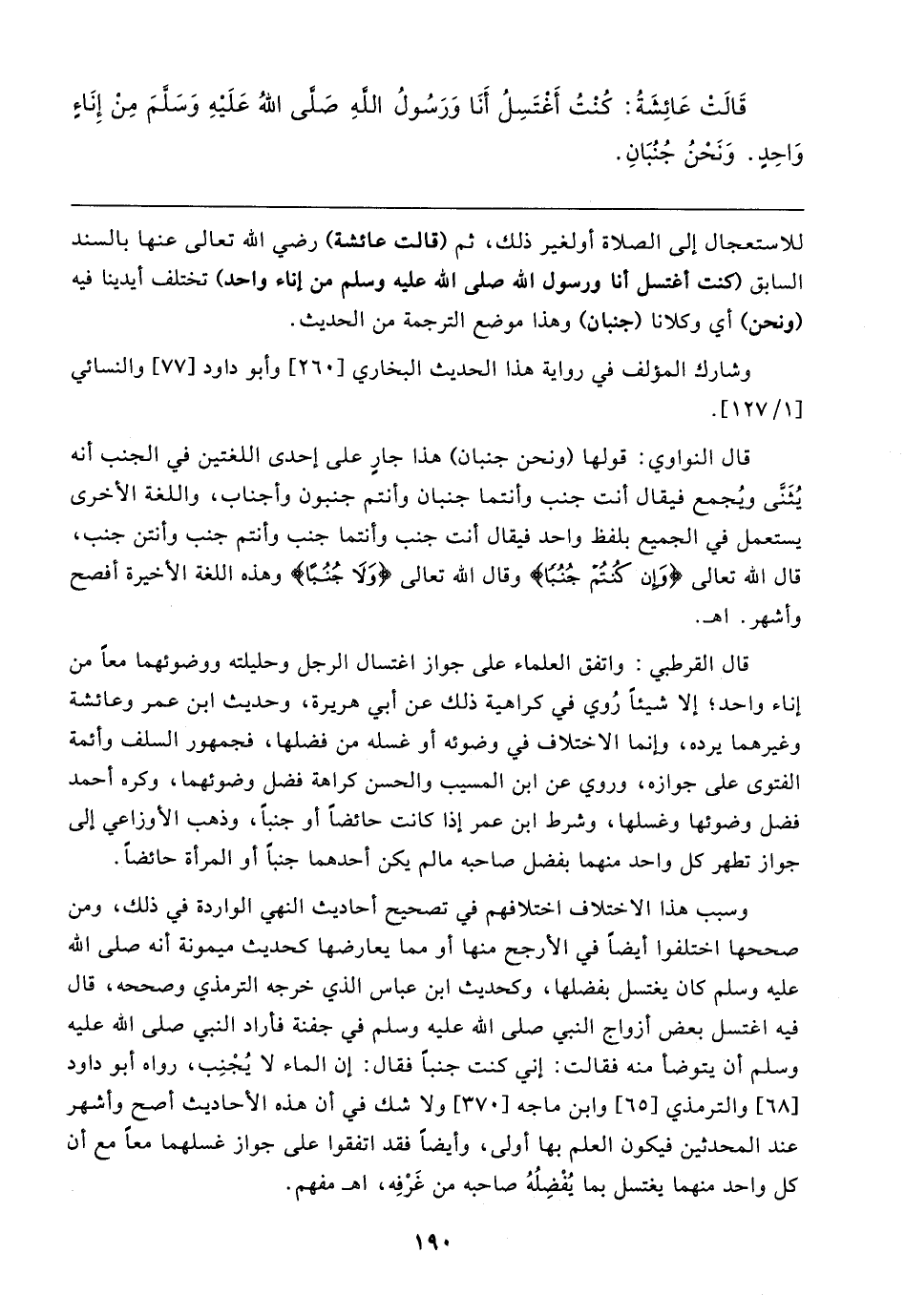 قَالتْ عَائِشَةُ: كُنْتُ اغتَسِلُ أَنَا وَرَسُولُ اللهِ صَلَّى اللهُ عَلَيهِ وَسَلَّمَ مِنْ إِنَاءٍ وَاحِدٍ. وَنَحْنُ جُنُبَانِ