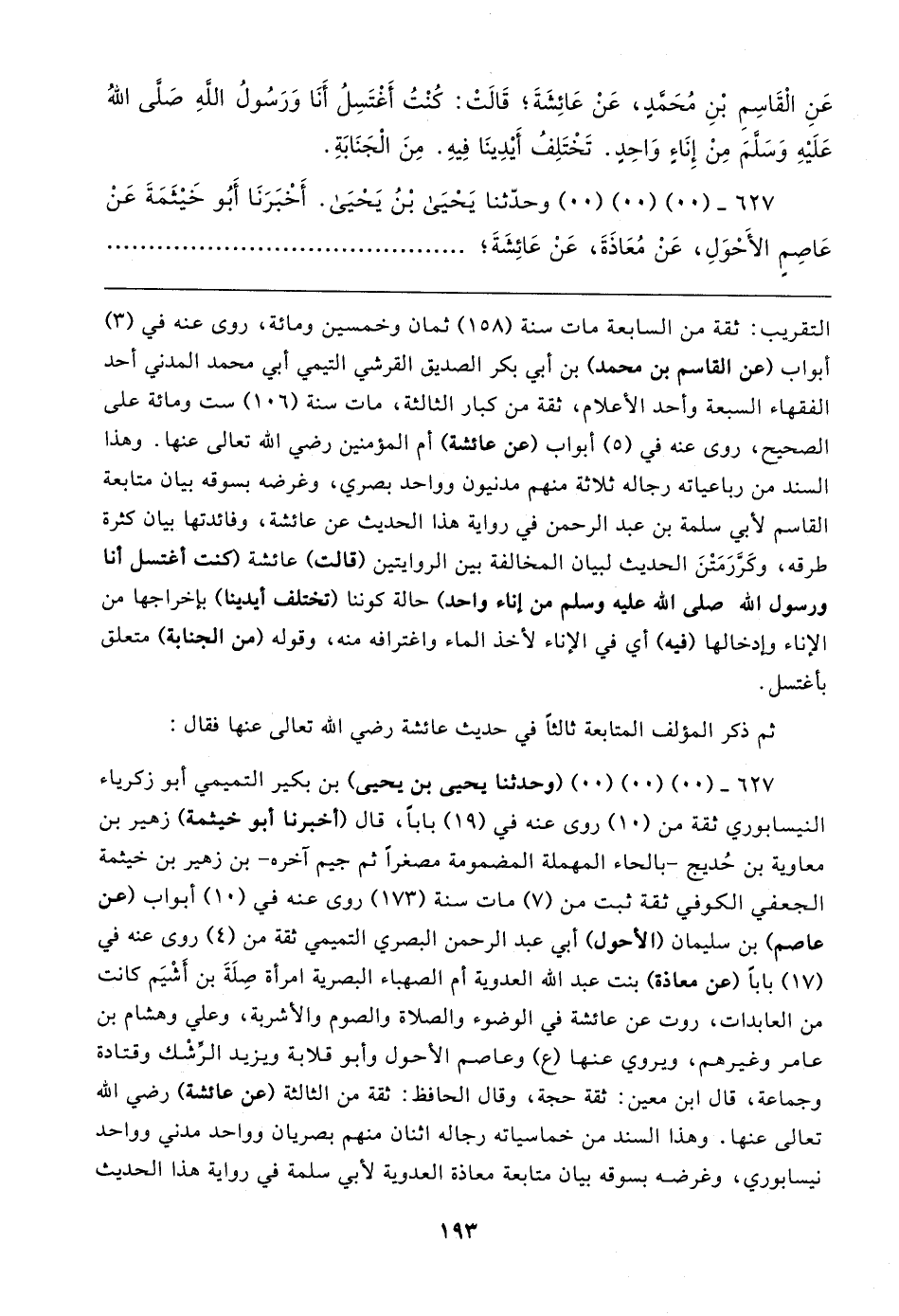 ٦٢٧ - (٠٠) (٠٠) (٠٠) (وحدثنا يحيى بن يحيى) بن بكير التميمي أبو زكرياء النيسابوري ثقة من (١٠) روى عنه في (١٩) بابا، قال (أخبرنا أبو خيثمة) زهير بن معاوية بن حُديج -بالحاء المهملة المضمومة مصغرًا ثم جيم آخره- بن زهير بن خيثمة الجعفي الكوفي ثقة ثبت من (٧) مات سنة (١٧٣) روى عنه في (١٠) أبواب (عن عاصم) بن سليمان (الأحول) أبي عبد الرحمن البصري التميمي ثقة من (٤) روى عنه في (١٧) بابا (عن معاذة) بنت عبد الله العدوية أم الصهباء البصرية امرأة صِلَةَ بن أَشْيَم كانت من العابدات، روت عن عائشة في الوضوء والصلاة والصوم والأشربة، وعلي وهشام بن عامر وغيرهم، ويروي عنها (ع) وعاصم الأحول وأبو قلابة ويزيد الرِّشْك وقتادة وجماعة، قال ابن معين: ثقة حجة، وقال الحافظ: ثقة من الثالثة (عن عائشة) رضي الله تعالى عنها. وهذا السند من خماسياته رجاله اثنان منهم بصريان وواحد مدني وواحد نيسابوري، وغرضه بسوقه بيان متابعة معاذة العدوية لأبي سلمة في رواية هذا الحديث