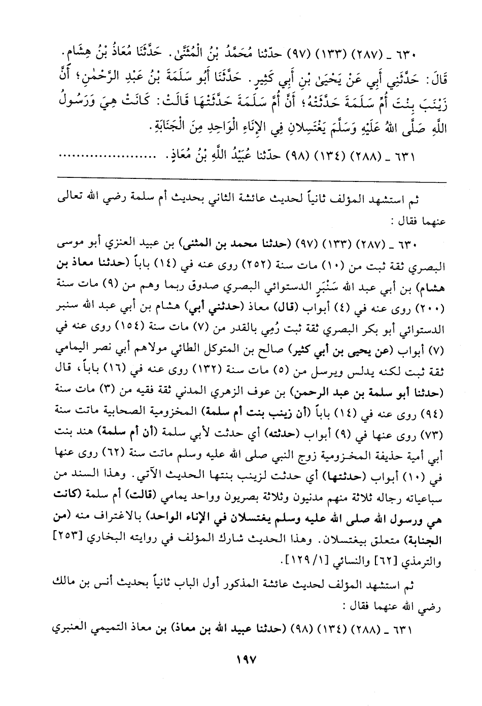 ٦٣٠ - (٢٨٧) (١٣٣) (٩٧) (حدثنا محمد بن المثنى) بن عبيد العنزي أبو موسى البصري ثقة ثبت من (١٠) مات سنة (٢٥٢) روى عنه في (١٤) بابا (حدثنا معاذ بن هشام) بن أبي عبد الله سَنْبَرٍ الدستوائي البصري صدوق ربما وهم من (٩) مات سنة (٢٠٠) روى عنه في (٤) أبواب (قال) معاذ (حدثني أبي) هشام بن أبي عبد الله سنبر الدستوائي أبو بكر البصري ثقة ثبت رُمِي بالقدر من (٧) مات سنة (١٥٤) روى عنه في (٧) أبواب (عن يحيى بن أبي كثير) صالح بن المتوكل الطائي مولاهم أبي نصر اليمامي ثقة ثبت لكنه يدلس ويرسل من (٥) مات سنة (١٣٢) روى عنه في (١٦) بابا، قال (حدثنا أبو سلمة بن عبد الرحمن) بن عوف الزهري المدني ثقة فقيه من (٣) مات سنة (٩٤) روى عنه في (١٤) بابًا (أن زينب بنت أم سلمة) المخزومية الصحابية ماتت سنة (٧٣) روى عنها في (٩) أبواب (حدثته) أي حدثت لأبي سلمة (أن أم سلمة) هند بنت أبي أمية حذيفة المخزومية زوج النبي صلى الله عليه وسلم ماتت سنة (٦٢) روى عنها في (١٠) أبواب (حدثتها) أي حدثت لزينب بنتها الحديث الآتي. وهذا السند من سباعياته رجاله ثلاثة منهم مدنيون وثلاثة بصريون وواحد يمامي (قالت) أم سلمة (كانت هي ورسول الله صلى الله عليه وسلم يغتسلان في الإناء الواحد) بالاغتراف منه (من الجنابة) متعلق بيغتسلان. وهذا الحديث شارك المؤلف في روايته البخاري [٢٥٣] والترمذي [٦٢] والنسائي [١/ ١٢٩].